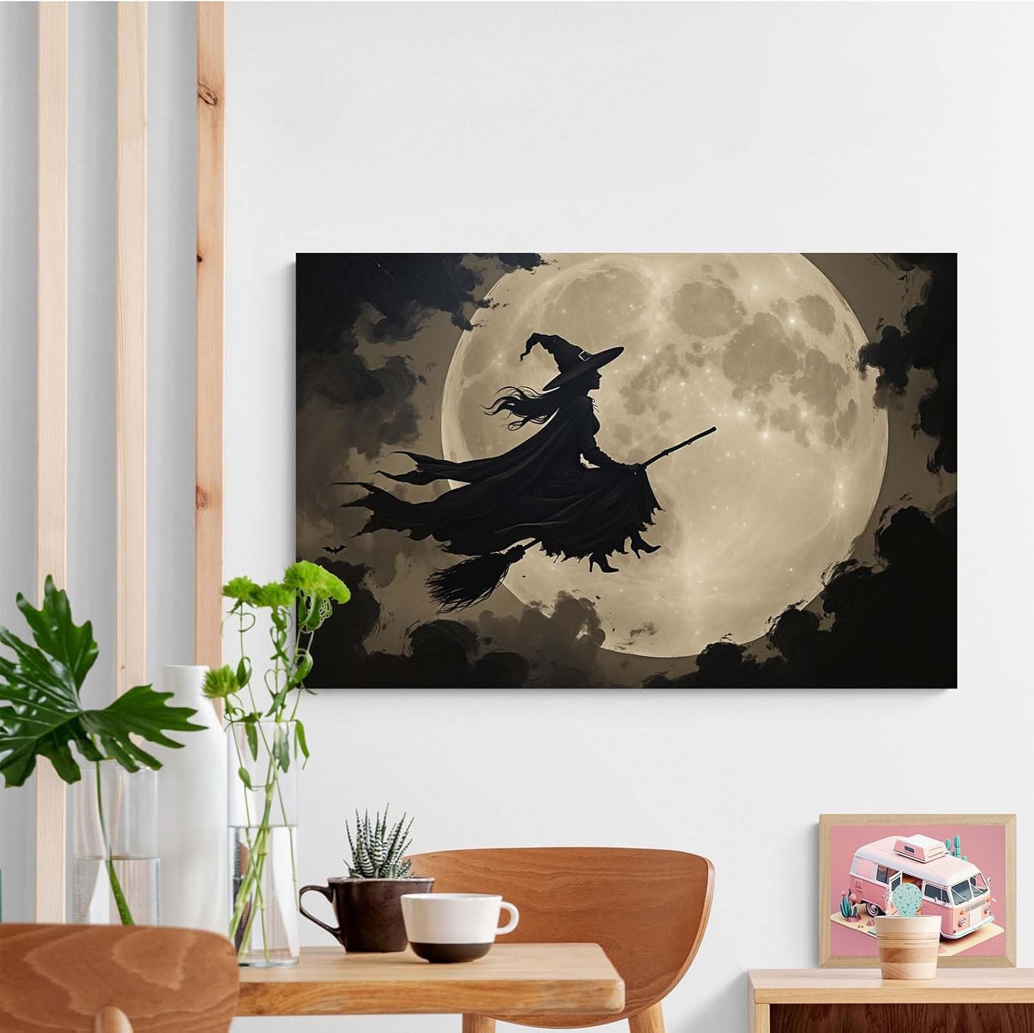 Full moon witch silhouette poster witch on magic broom Halloween mural poster decorative mural art suitable for home living room bedroom8x12in Wood Framed
