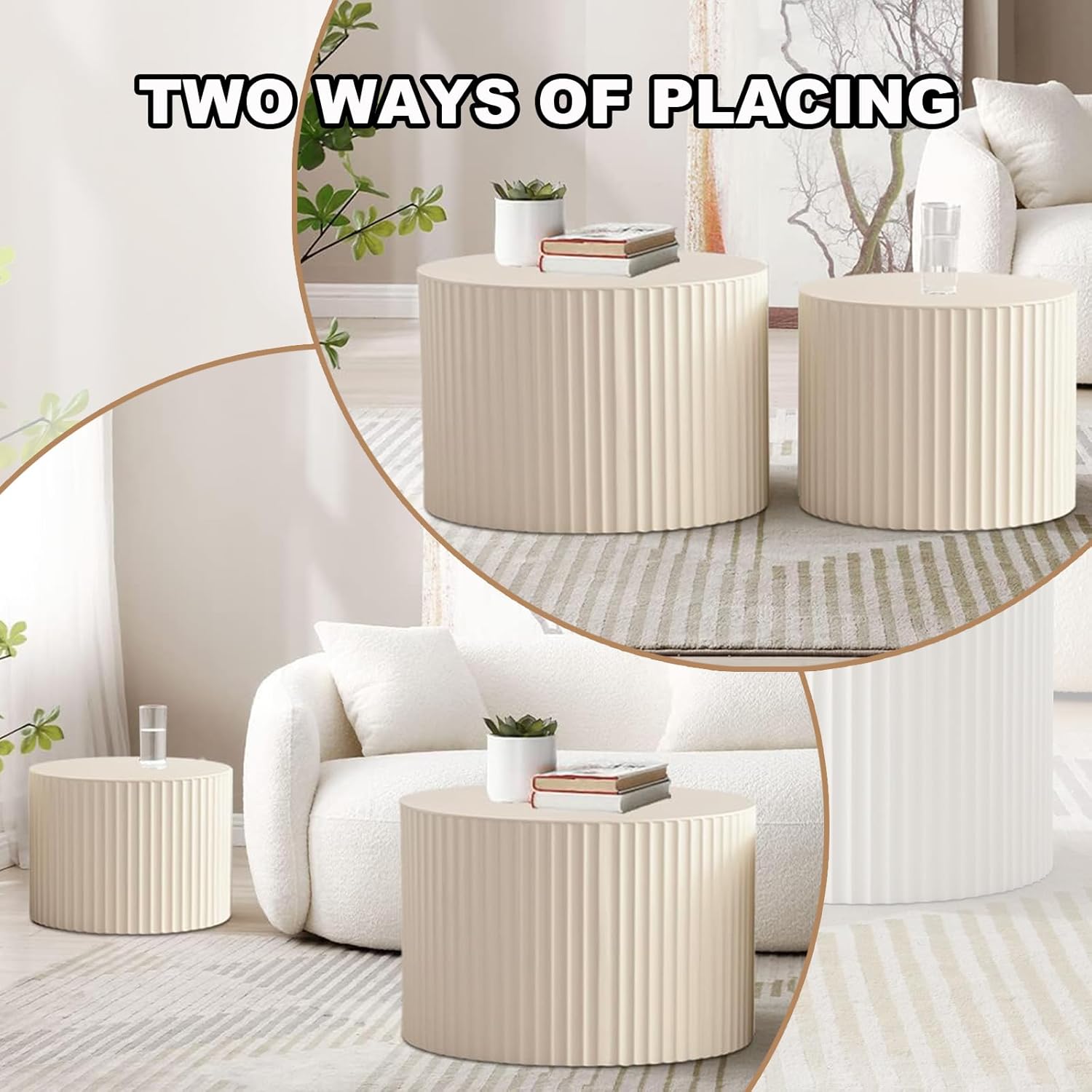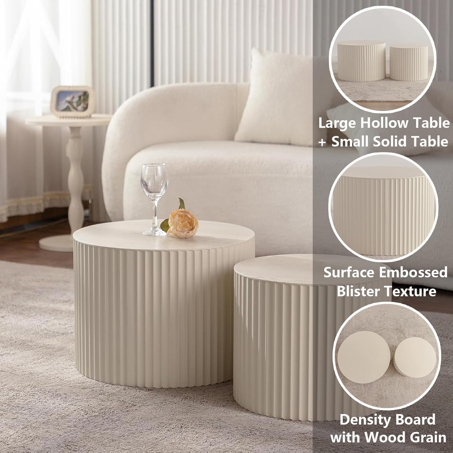 Round Nesting Coffee Table Set of 2, Modern Coffee and End Table Set Small Circle Wooden Drum Side Table Accent End Tables for Living Room Office, No Assembly,Cream Large
