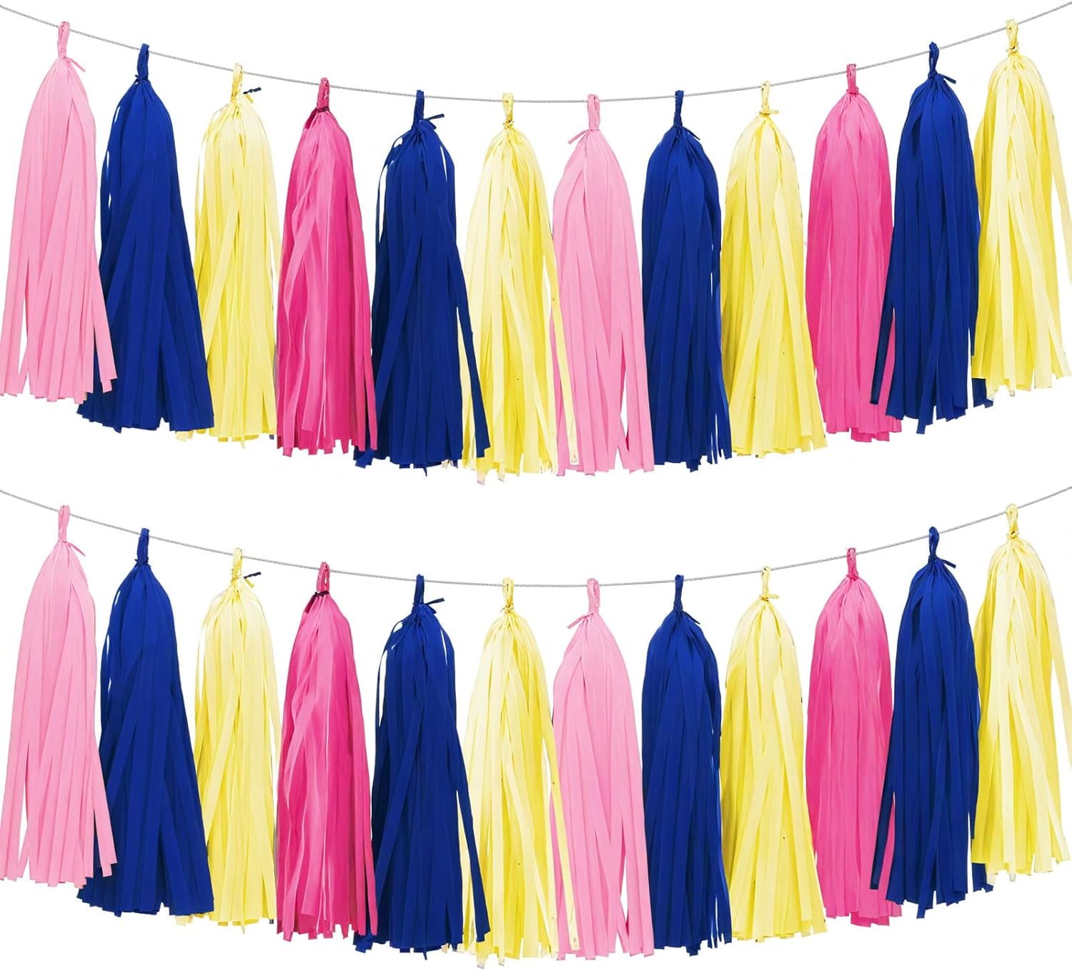 - PACKAGE CONTENTS: Set of 20 tissue paper tassels in hot pink navy blue lemon yellow pink, a 6-foot twine for easy hanging and instant decoration