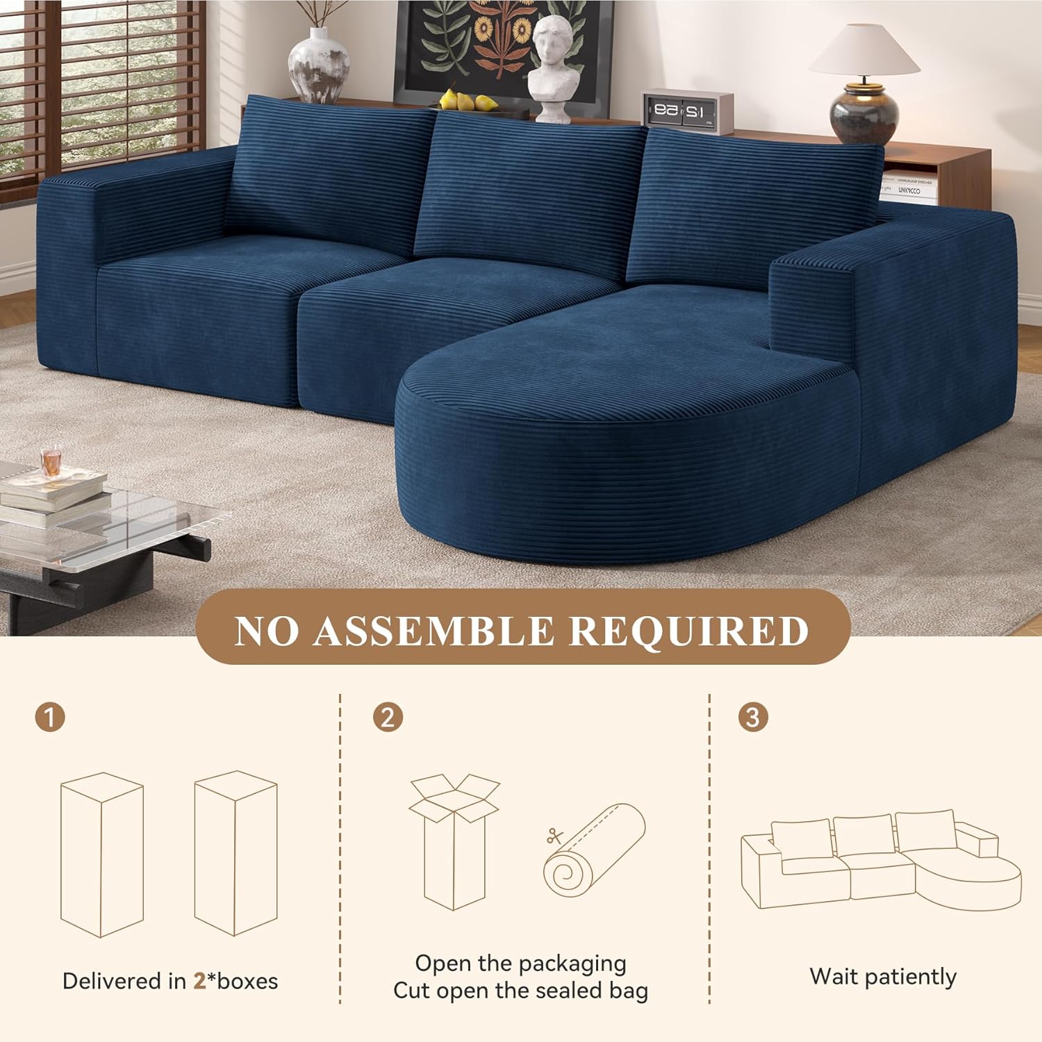- NO ASSEMBLY REQUIRED: "Say Goodbye to Furniture Setup Hassles!" Delivered as a sofa in a box, this convertible sofa bed is vacuum-packed for easy handling. Once unwrapped, it “pops” into shape, needing just a few gentle pats to enhance its resilience and fluffiness. Fully restores within 72 hours for the best lounging experience.