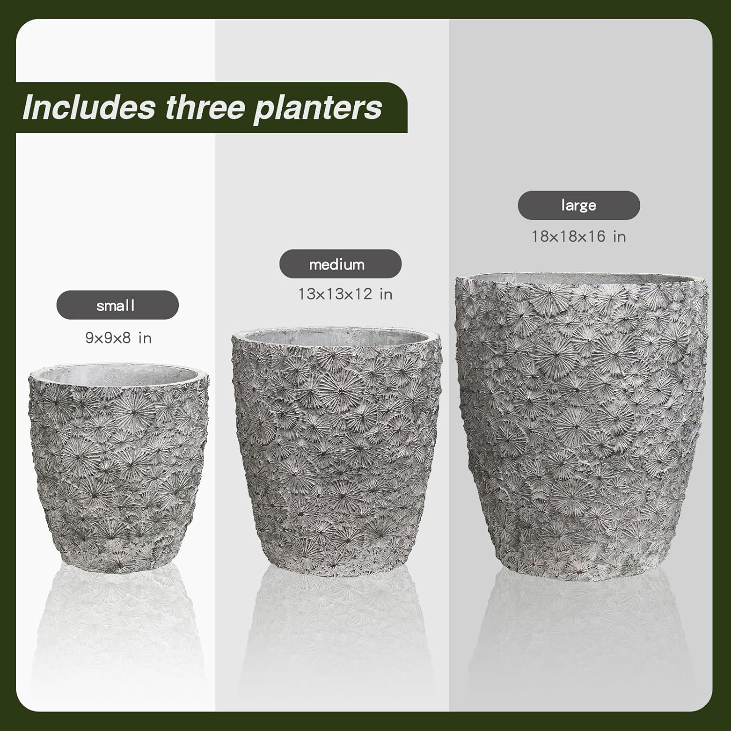 - Set of 3 Sizes: Includes three planters in small (9"x9"x8"), medium (13"x13"x12"), and large (18"x18"x16") sizes, allowing for a layered or staggered display of plants.