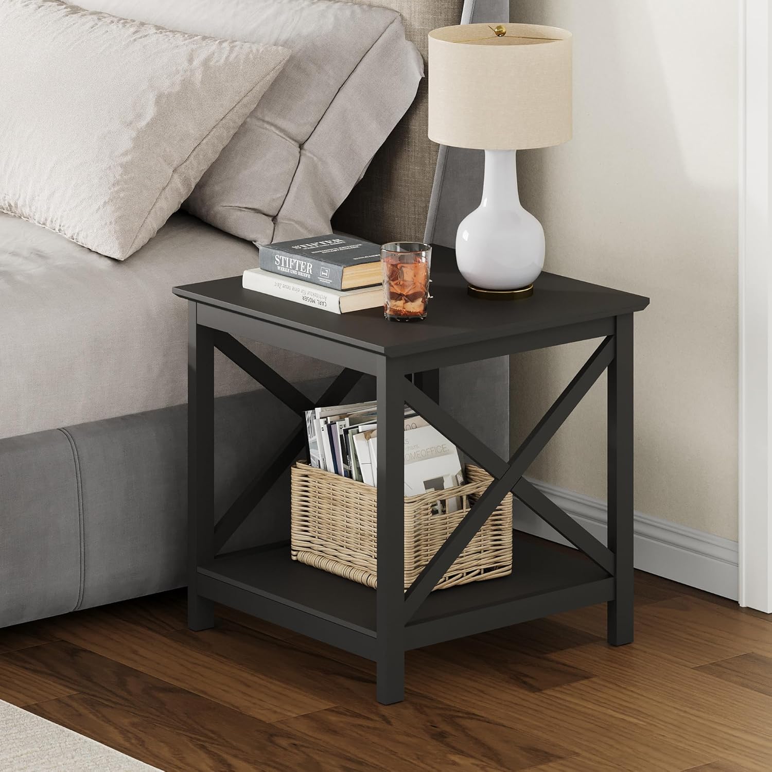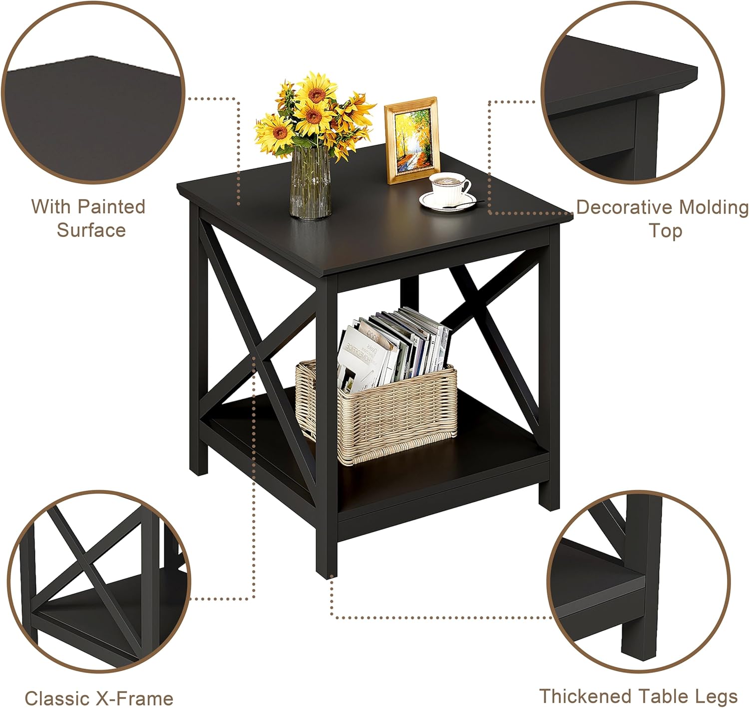 - 【Square and X-Frame Design】With a sleek square design and decorative X-frame sides, this side table blends form and function. Its timeless design complements modern, farmhouse, and transitional interiors