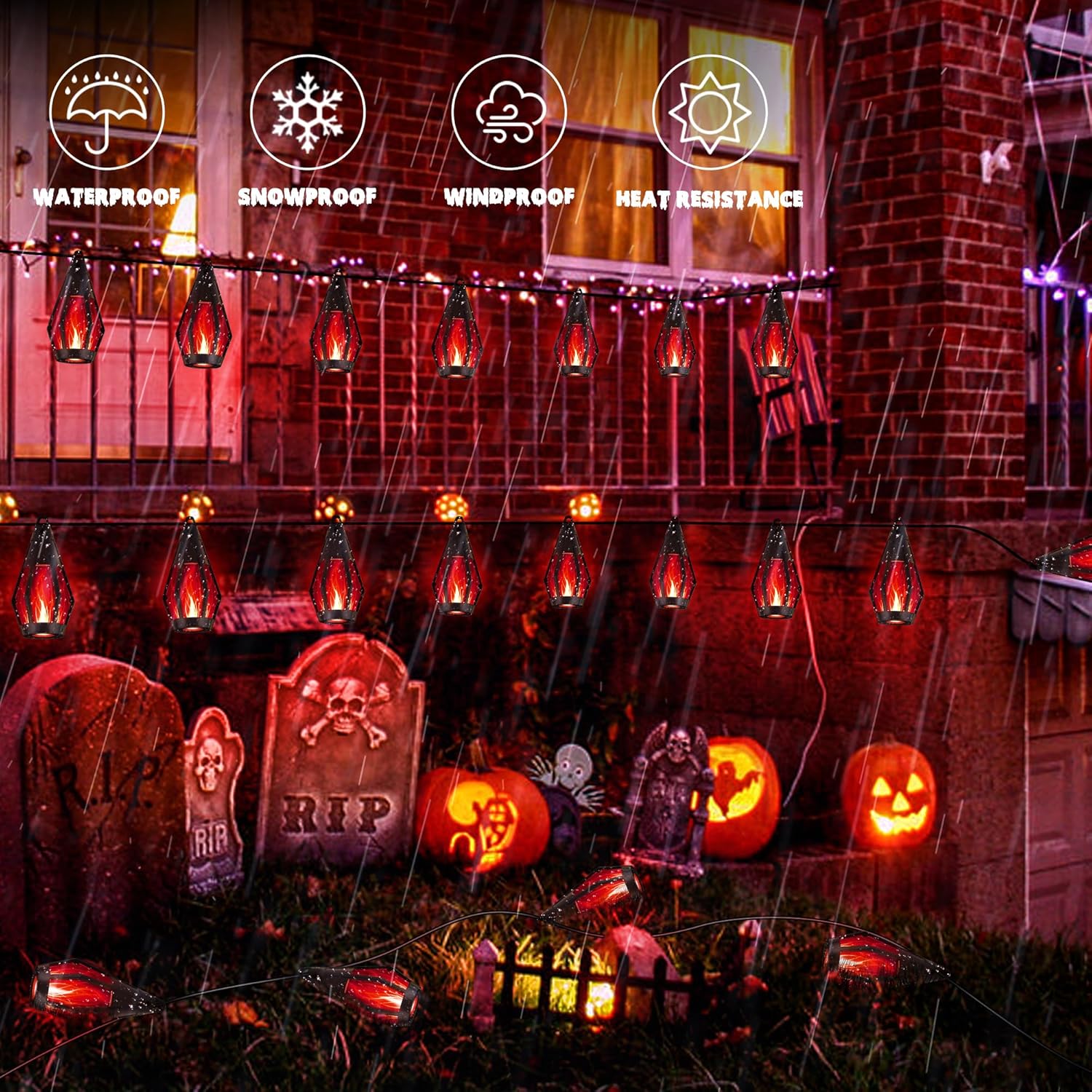 - Flickering Dancing Flames String Lights: iBaycon solar Halloween string lights feature a stunning dancing flame design, offering a realistic flame effect that adds a charming ambiance to any setting