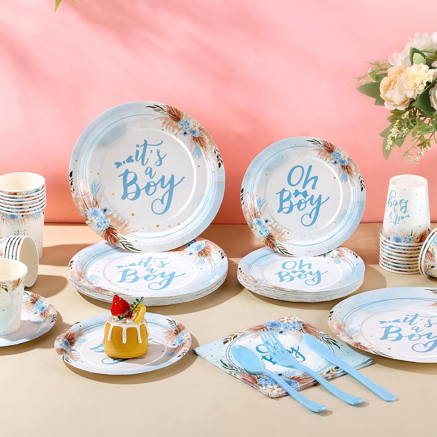 - ăIts A Boy Baby Shower Decorationsă- Baby shower plates and cups and napkins sets include 24 9 inch baby shower plates, 24 7-inch baby boy shower plates, 24 baby boy shower cups, 24 baby shower napkins for boy, 24 sets of plastic utensils (forks, spoons, knives), 168 pieces in total. This is a great baby boy baby shower decorations.