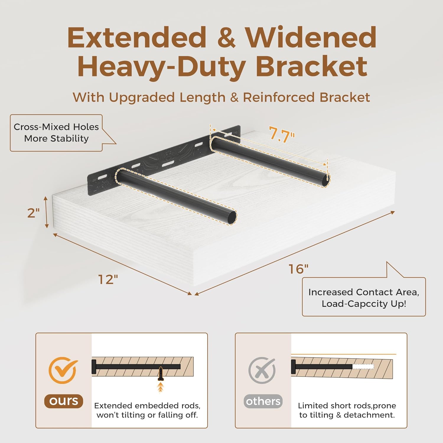 12 Inch Deep White Floating Shelves, 16 x 12 Floating Shelf for Books, Rustic Wood Deep Wall Shelves for Home Storage & Display, 2" Thicked Shelves for Kitchen, Living Room, Bedroom, 2 Pack