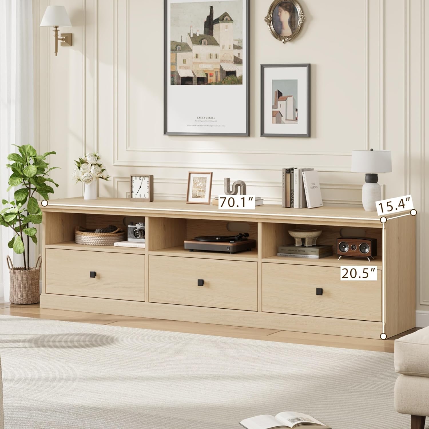 - DIMENSIONS & STORAGE: This tv cabinet measures 70β L x 15.4β W x 20.5β H and accommodates flat or curved TVs up to 75 inches. The tv console table provides ample storage space with a combination of open shelves for decor and media devices, plus drawers to neatly stow away remotes, cables, and other essentials