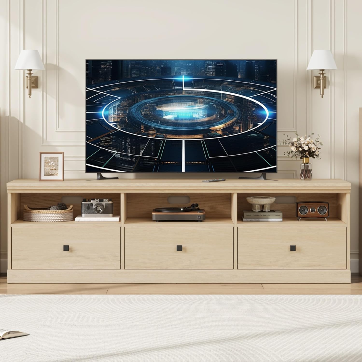 - MODERN STYLISH DESIGN: This media center showcases clean lines and subtle hardware, offering a sleek, minimalist aesthetic that enhances any contemporary space. Its neutral wood tone adds an elegant touch, seamlessly blending with your decor, making it an ideal choice for the living room, bedroom, or lounge area