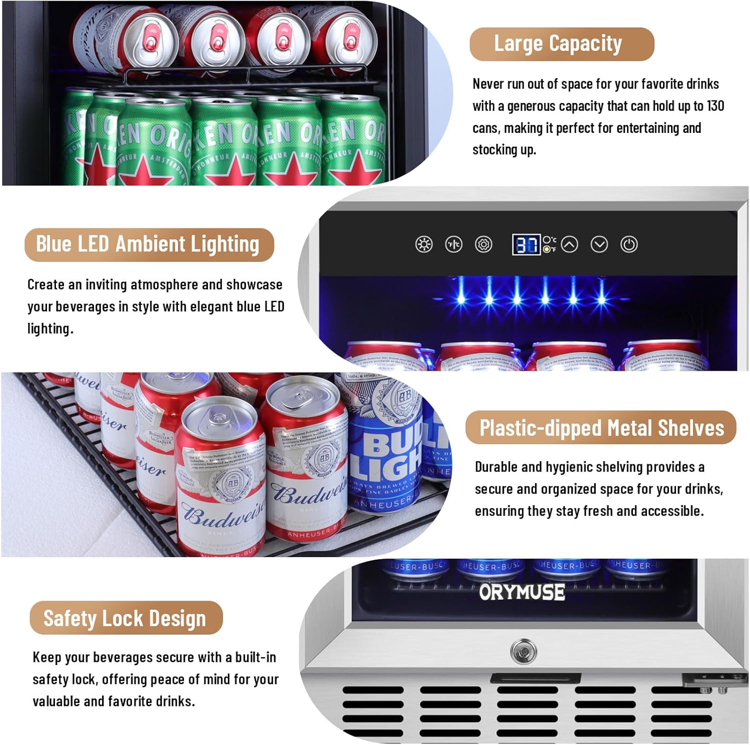 - LARGE CAPACITY - The ORYMUSE 15 Inch beverage refrigerator boasts an large capacity, accommodating up to 130 cans of your preferred beverages, and it can handle larger bottles with ease. With a temperature range of 37-64°F, it's the ideal choice for you. The soothing blue LED lighting creates an aesthetically pleasing ambiance, making it effortless to pick your beverage of choice anytime
