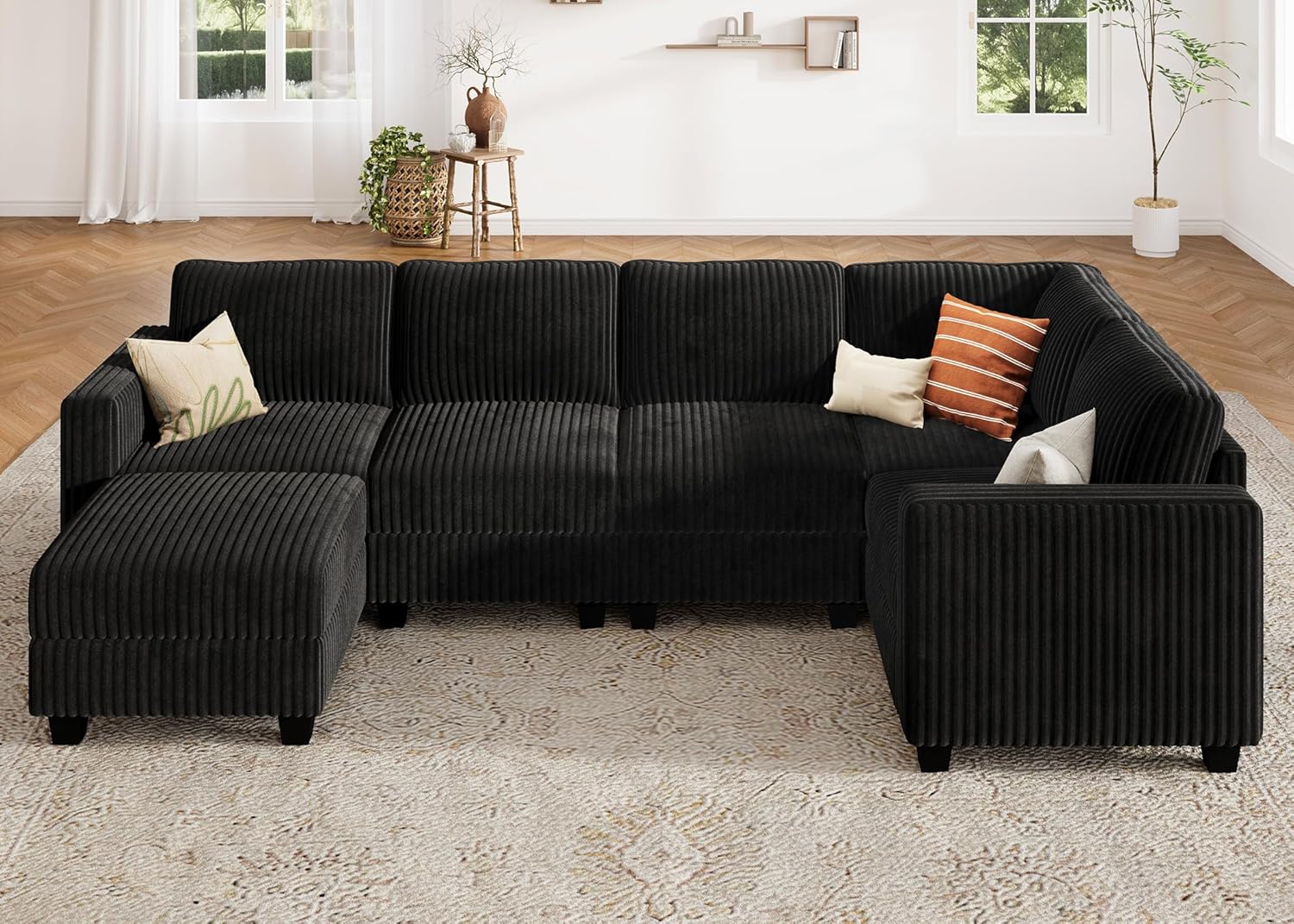 HONBAY Plush Corduroy Sectional Couch with 6 Seaters U-Shaped Modular Sectional Sofa with Storage Sectional Couches for Living Room, Black