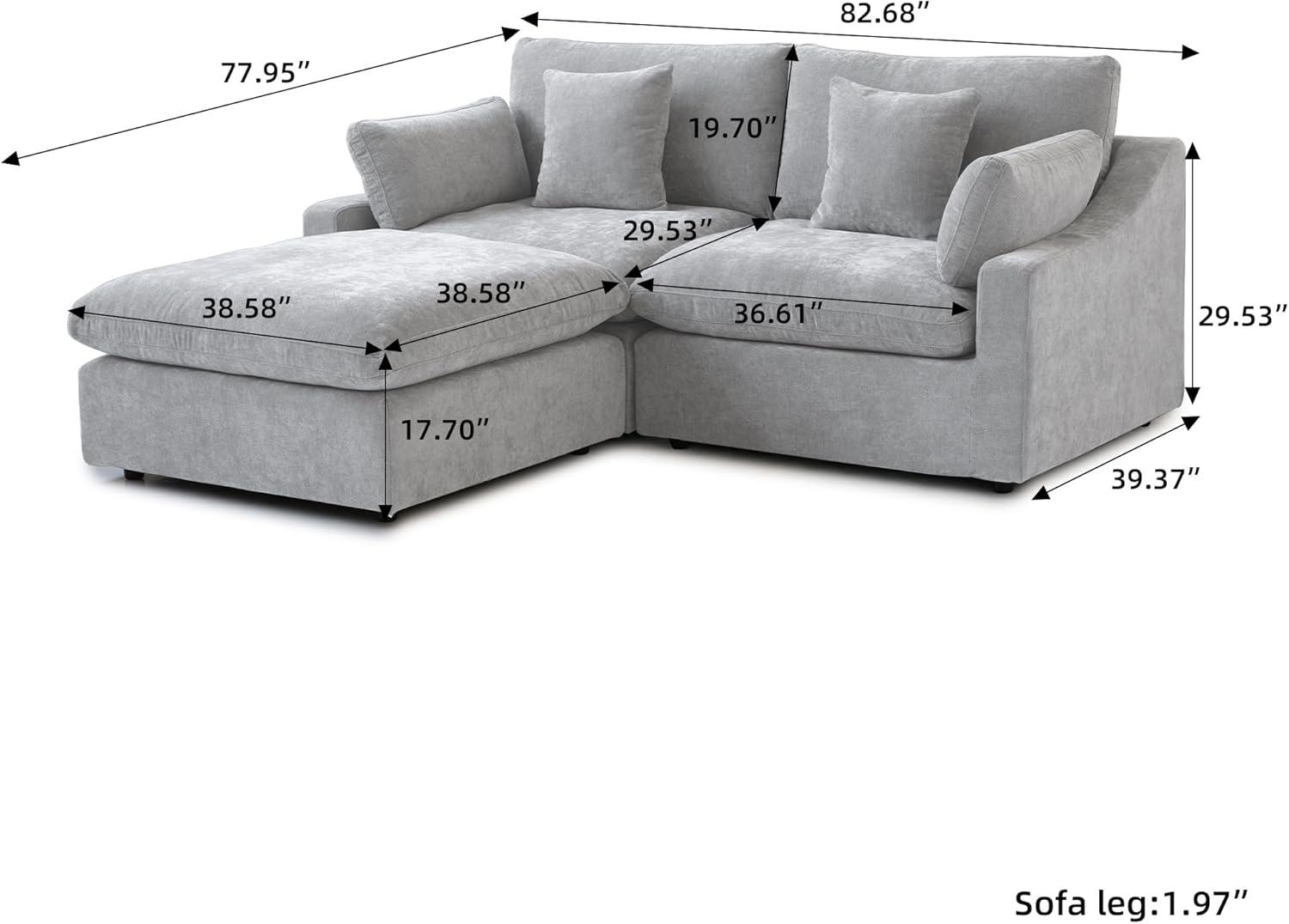 - β [Size Information] Overall Size: 82.68"L x 77.95"W x 29.53"H. The cushion cover, backrest cover, and frame cover of the sofa can all be removeable and washable. You can easily keep the sofa clean.