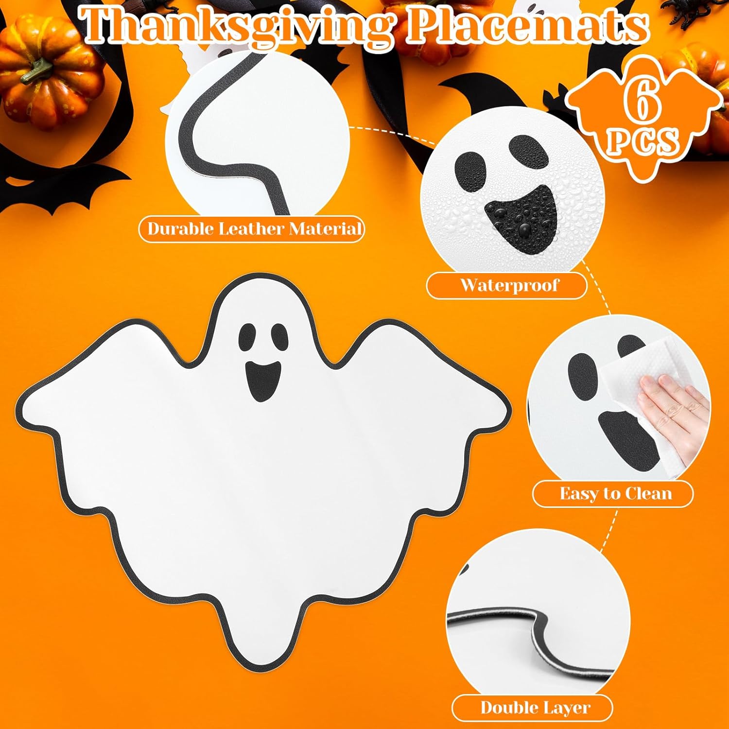- Durable Leather Material: the waterproof Halloween ghost reversible placemats are made from quality leather, ensuring soft, durable, wrinkle proof, heat resistant, non slip and stain resistant, hemmed and reinforced edges can help to keep placemats from Fraying, easily coping with accidental spills and stains during daily dining