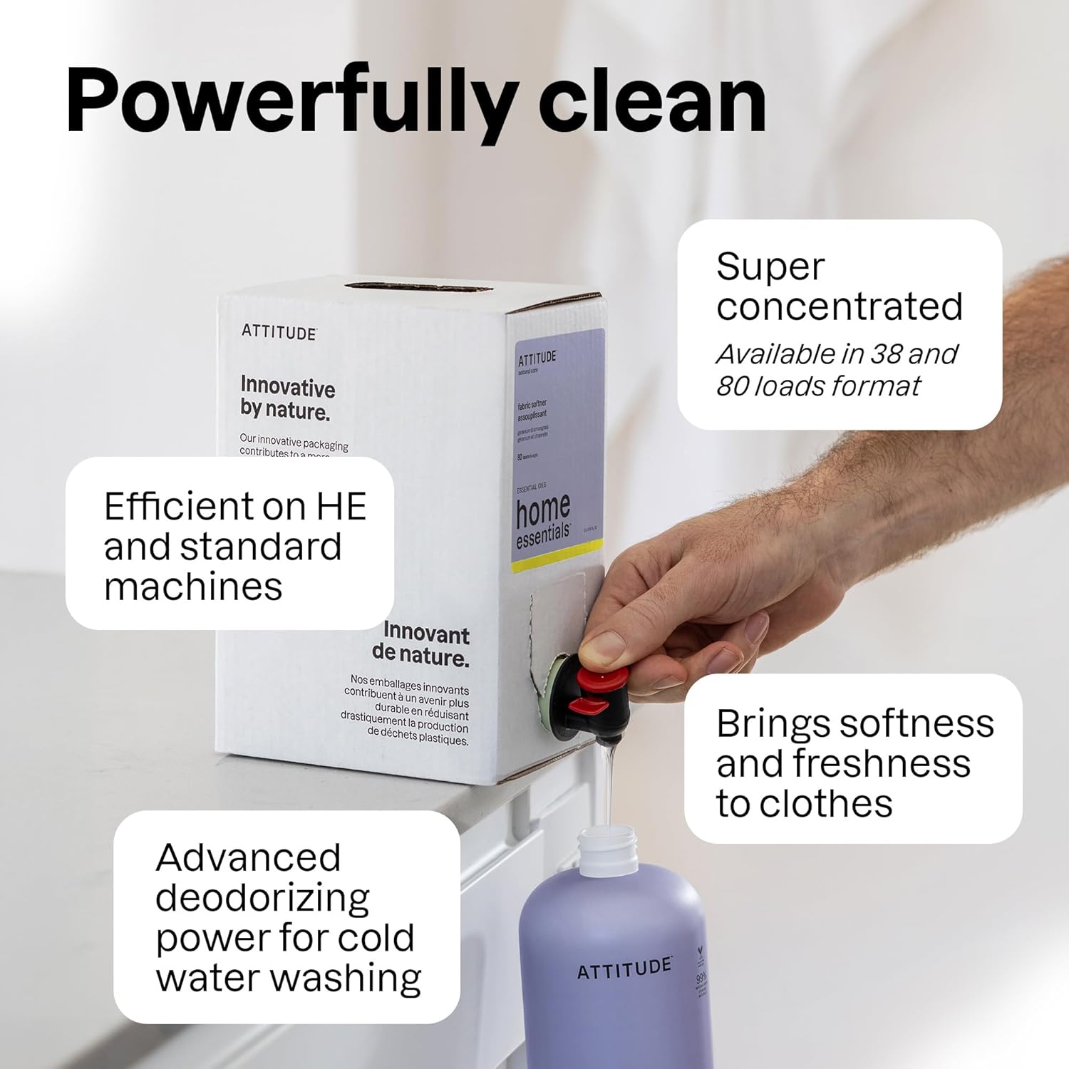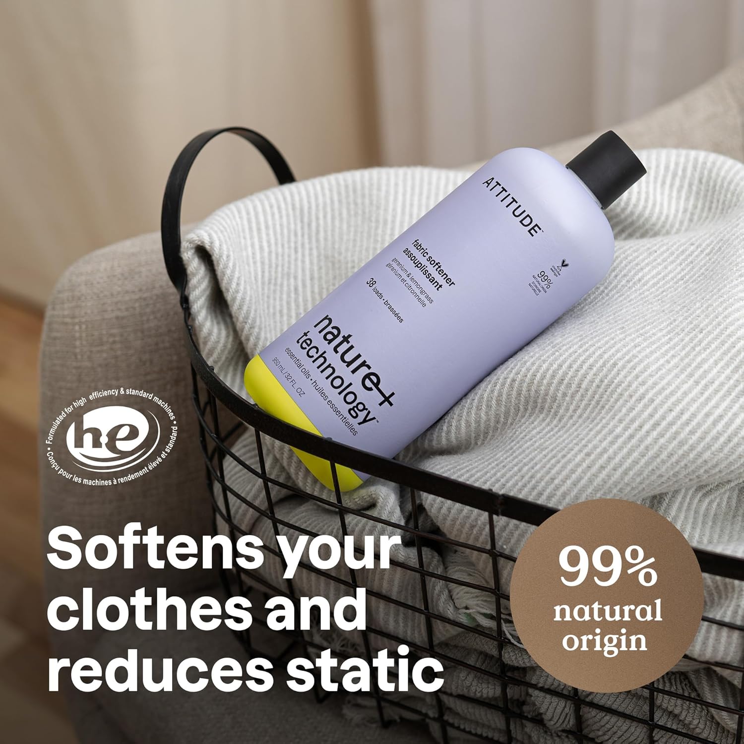 ATTITUDE Liquid Fabric Softener, Natural Origin Ingredients, For White and Colored Clothing, Deodorizes, Gentle on Delicate skin, Infused With Essential Oils, Geranium & Lemongrass, 38 Loads, 32 Fl Oz