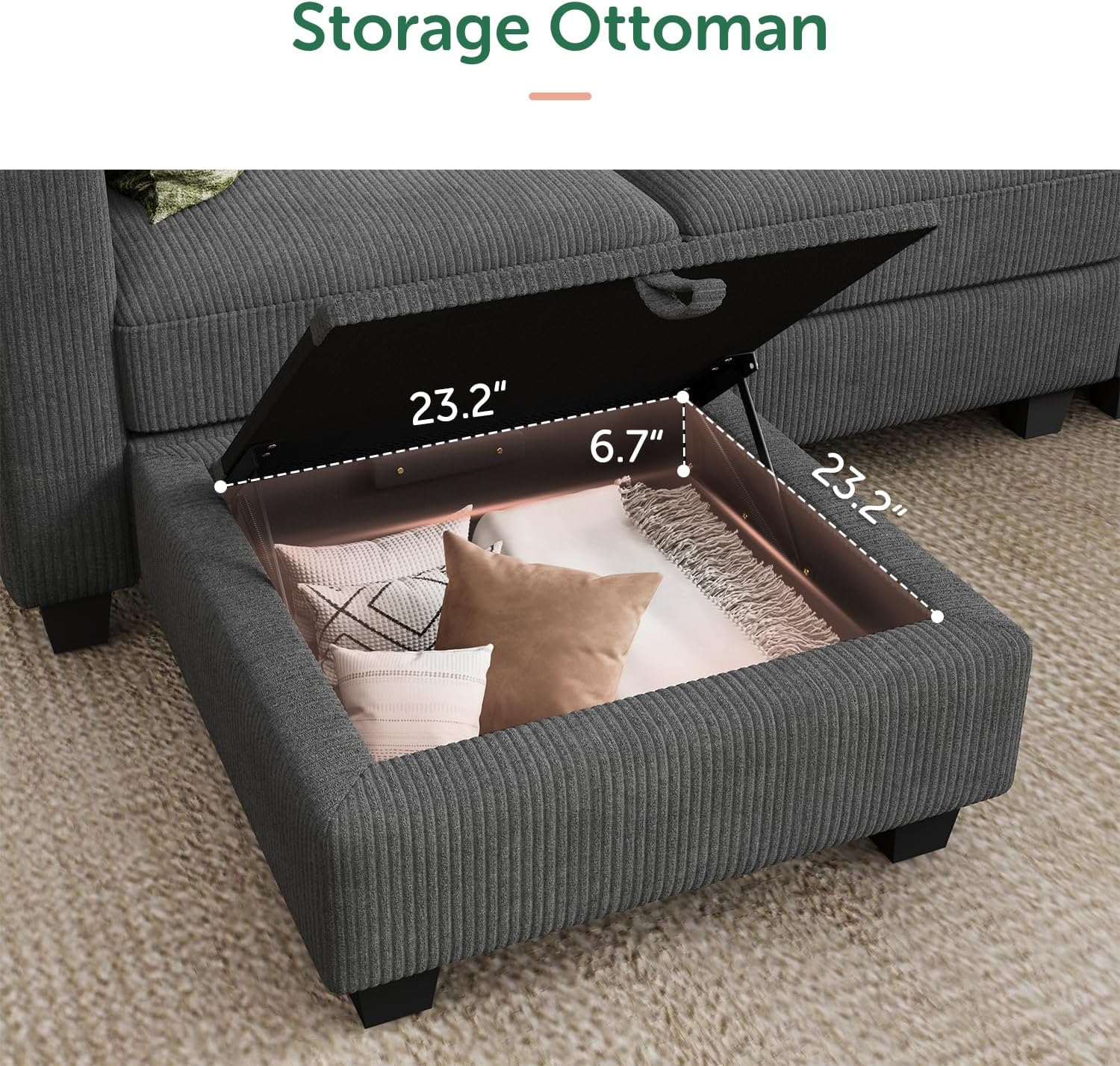 - Smart Storage Solutions: Hidden storage ottomans keep clutter at bay. Ottomans of the modular couch have built-in storage for pillows, toys, or whatever you want