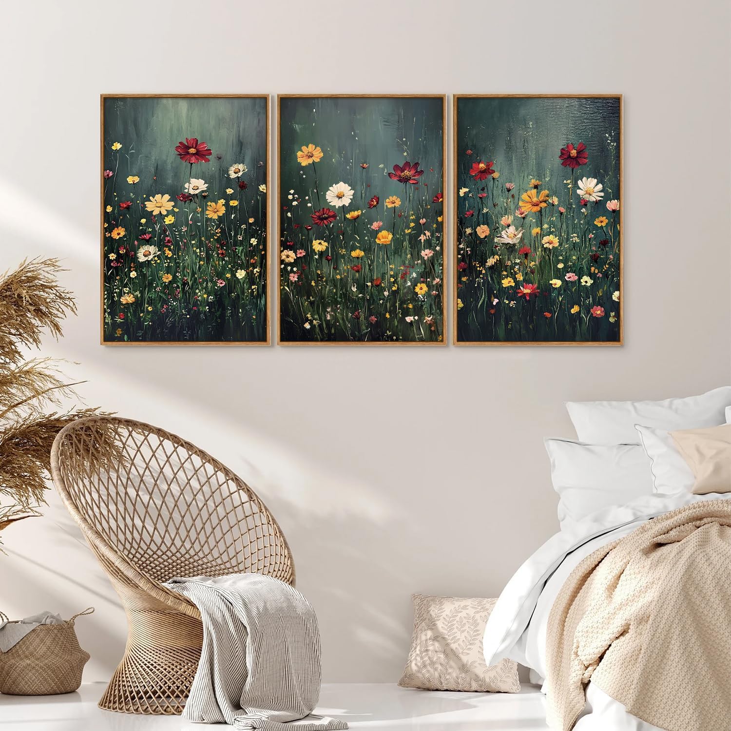 SIGNINART Vintage Floral Framed Canvas Wall Art, Dark Moody Wildflowers Wall Decor, Boho Abstract Flowers Artwork, Colorful Botanical Aestheticrt Art Paintings for Bedroom Living Room Office 16"x24"x3