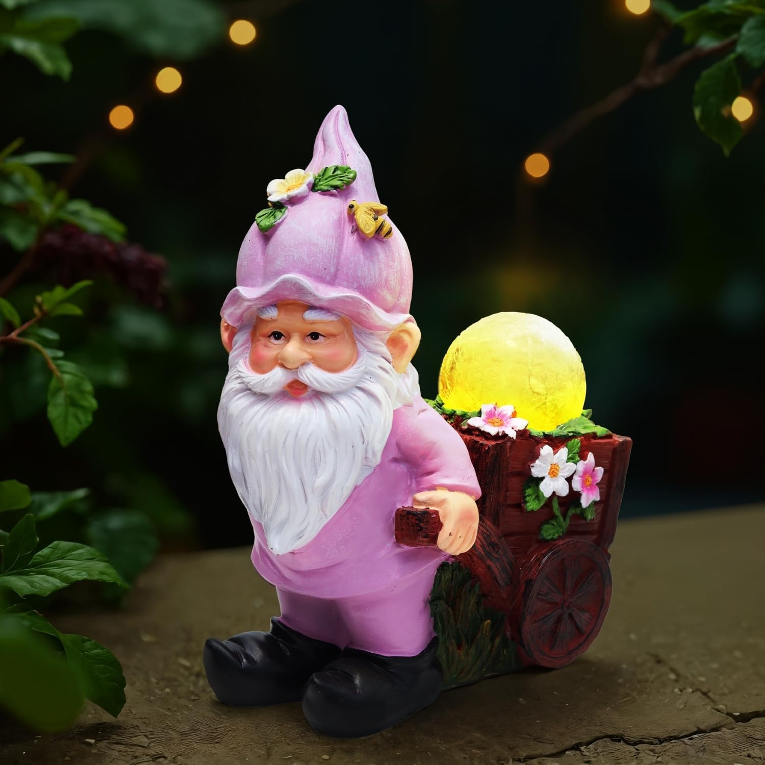 - Charming Gnome with a Magical Glow – Add a playful touch to your garden with this adorable pink gnome pulling a cart that carries a solar-powered crackle glass globe. It brings storybook magic and cheerful personality to any outdoor space.