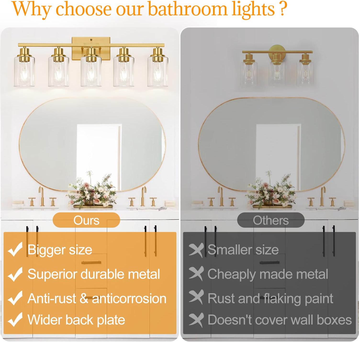- Elegant Brushed Gold Design: Elevate your space with this brushed gold bathroom light fixture, featuring a sleek brushed gold lamp body and clear glass shades. The upgraded finish includes a scratch-resistant and tarnish-resistant coating, ensuring it retains its luxurious appearance over time. Perfect for modern, farmhouse, or traditional decor, itâs a versatile addition to any home.