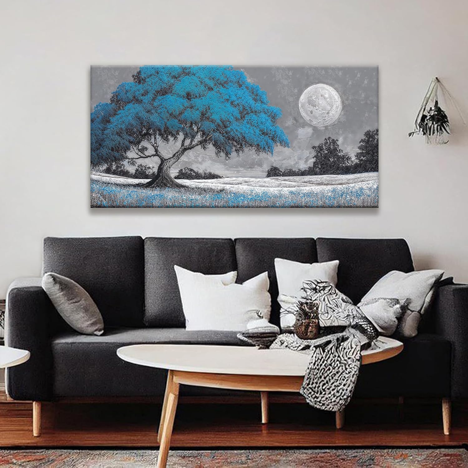 TAIJXAGSG Wall Art For Living Room Blue Tree Moon Canvas Art Wall Print Decor Artwork Print Painting 24" X 48" Modern Wall Art Picture For Bedroom Modern Salon Kitchen Office Home Wall Decor