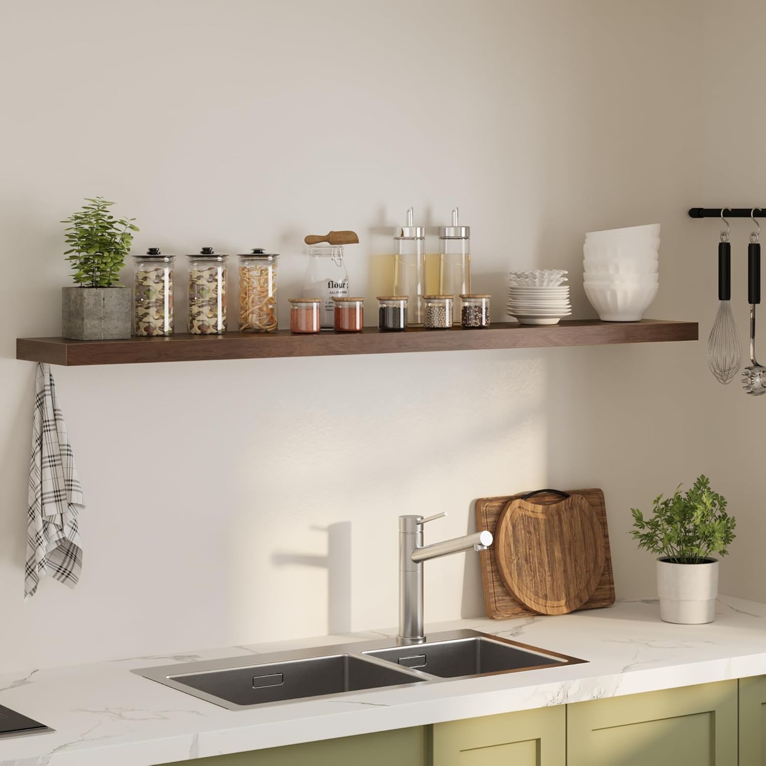 - 1.5 Inches Thick Heavy Duty Floating Shelves: Measuring 72 inches long, 9.3 inches deep, and 1.5 inches thick, our floating wood shelf offers reliable strength and lasting stability. Its solid construction easily supports heavier items such as books, framed art, or small potted plants. Designed for both function and durability, itâs a dependable storage and display solution for any roomâwhether itâs the kitchen, office, living room, or bedroom
