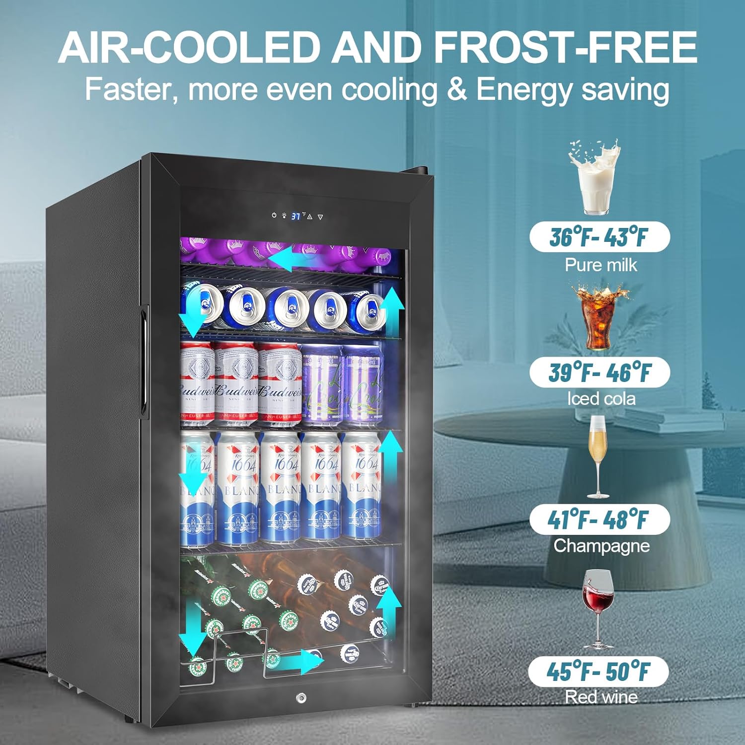 - POWERFUL COMPRESSOR & FAST COOLING TECHNOLOGY: Equipped with an advanced compressor and 360 °air circulation system, this beverage fridge ensures rapid and even cooling throughout the entire interior. The constant low temperature keeps your drinks chilled to perfection, ideal for quick refreshment anytime. Perfect for home theaters, kitchens, offices, RVs, dorm rooms, apartments, or gaming rooms, enjoy ice-cold beverages wherever you are.