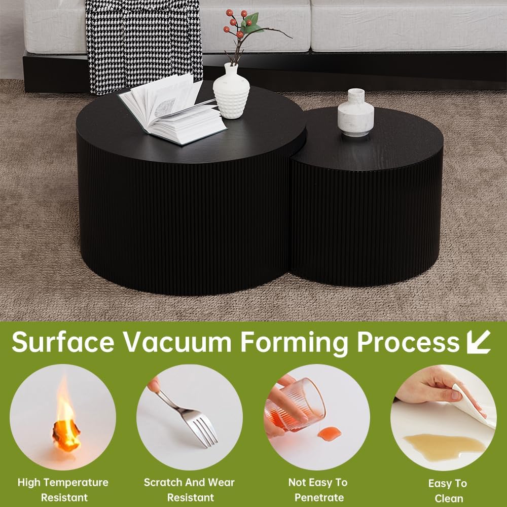 Round Nesting Coffee Table Set of 2 Small Round Coffee Tables for Living Room Modern Fluted Coffee Table Circular End Table Side Table for Small Spaces No Assembly (Black B, 27 in)