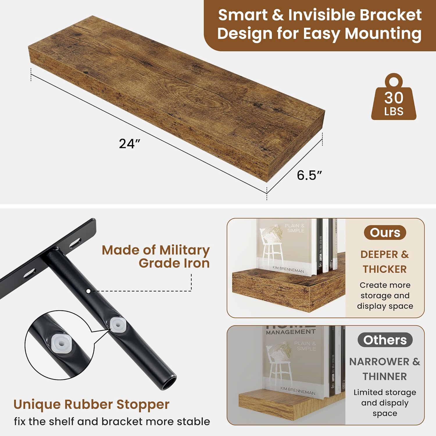 fuqing Floating Shelves for Wall, Bathroom Shelf Wall Mounted for Storage, Shelves with Invisible Bracket for Bedroom, Kitchen, Living Room, Farmhouse Small Book Shelf, 24 Inch Set of 2, Rustic Brown