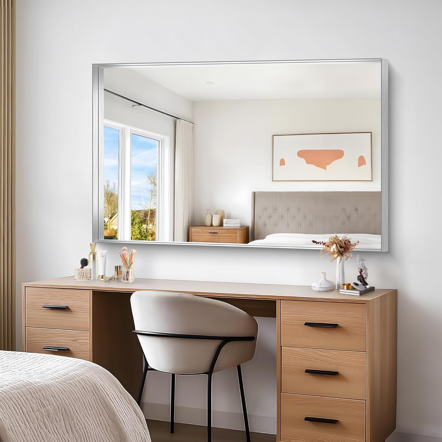 - Crystal-Clear Reflection, Zero Distortion this silver wall-mounted bathroom mirror delivers a true 1:1 image reflection—no blurring, warping, or distortion. The ultra-durable glass is scratch-resistant and easy to clean, making it the perfect vanity mirror for a sleek, modern bathroom
