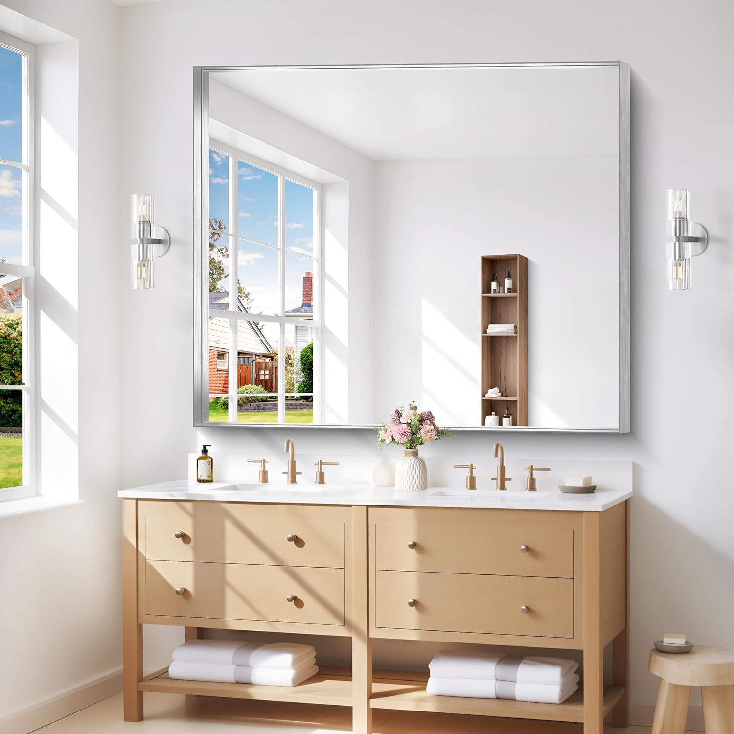 - Crystal-Clear Reflection, Zero Distortion this silver wall-mounted bathroom mirror delivers a true 1:1 image reflection—no blurring, warping, or distortion. The ultra-durable glass is scratch-resistant and easy to clean, making it the perfect vanity mirror for a sleek, modern bathroom