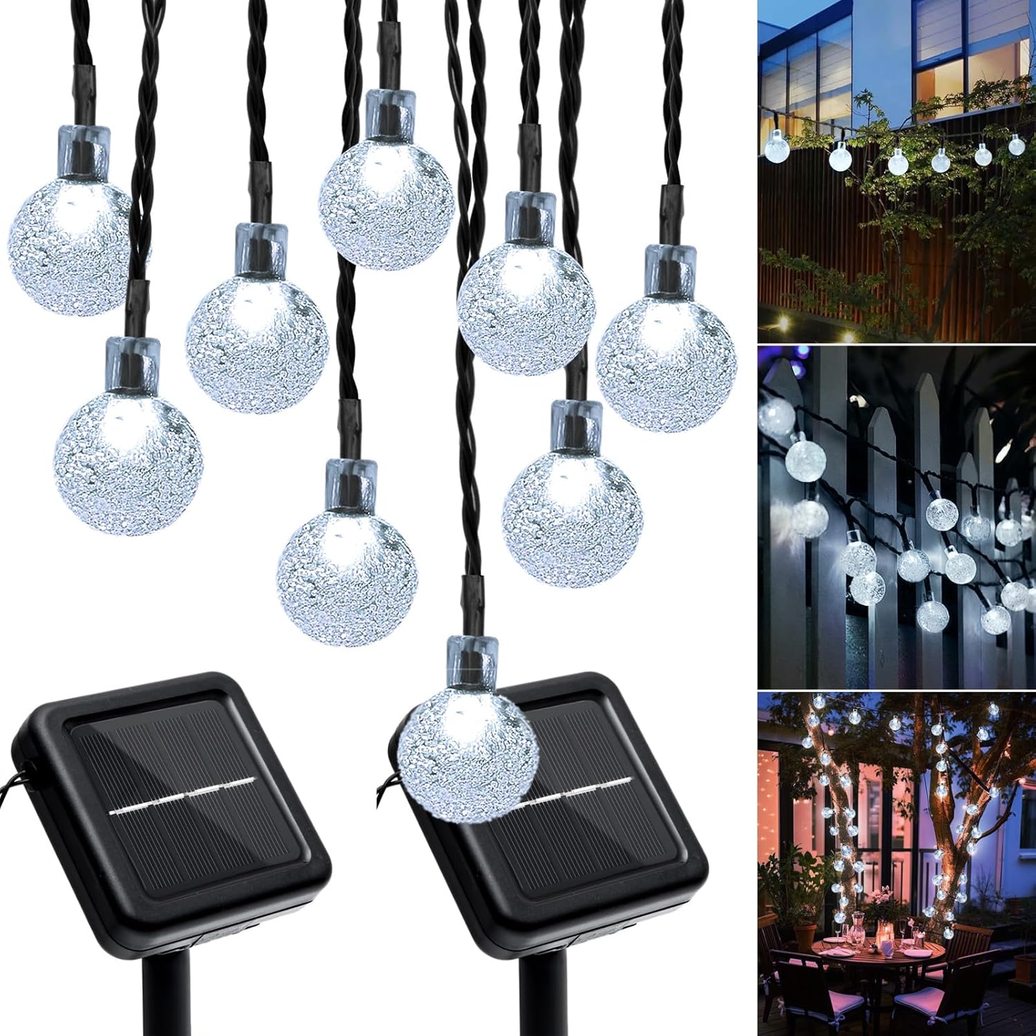 - 【New Generation - 2x46FT 66LEDs Crystal Globe Solar String Lights】Solar string lights outdoor waterproof is made of IP65 Waterproof material, which can withs stand all kinds of extreme weather. Each light has 66 bright LED Crystal Globe bulbs,total lenth 46FT,the diameter of each Crystal Globe is 2.3cm/0.9inch.
