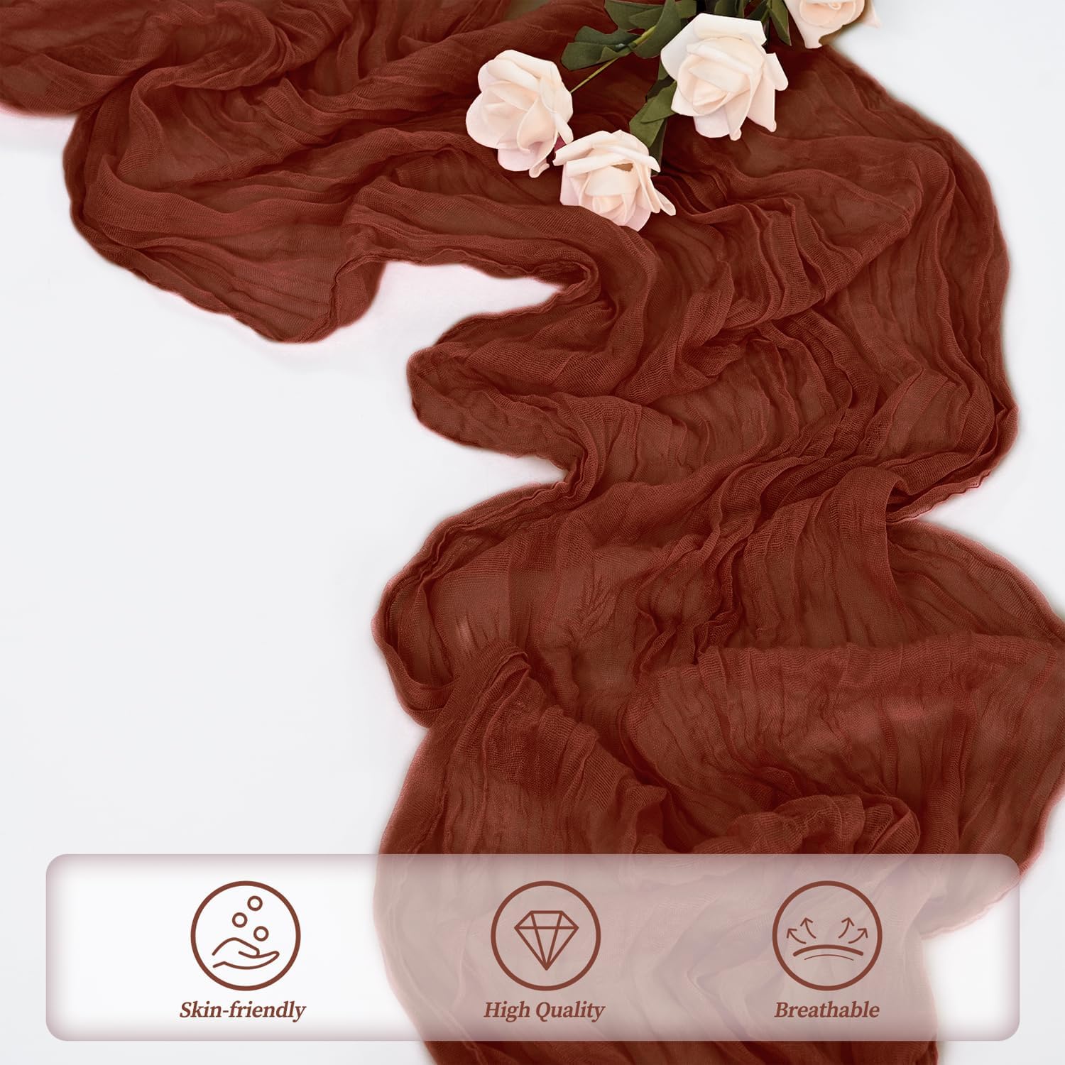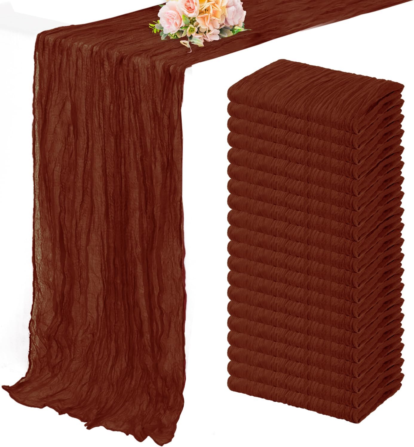 - Cheesecloth Table Runner Size: You will receive 20 terracotta cheesecloth tablerunner, each measuring 20 x 120 inches. The quantity is sufficient for you to decorate various romantic occasions. It can decorate most shaped tables, such as rectangular tables, round tables, and cocktail tables. It is long enough to decorate a large table and be placed perfectly and elegantly on the tabletop, adding a romantic atmosphere to your occasion.