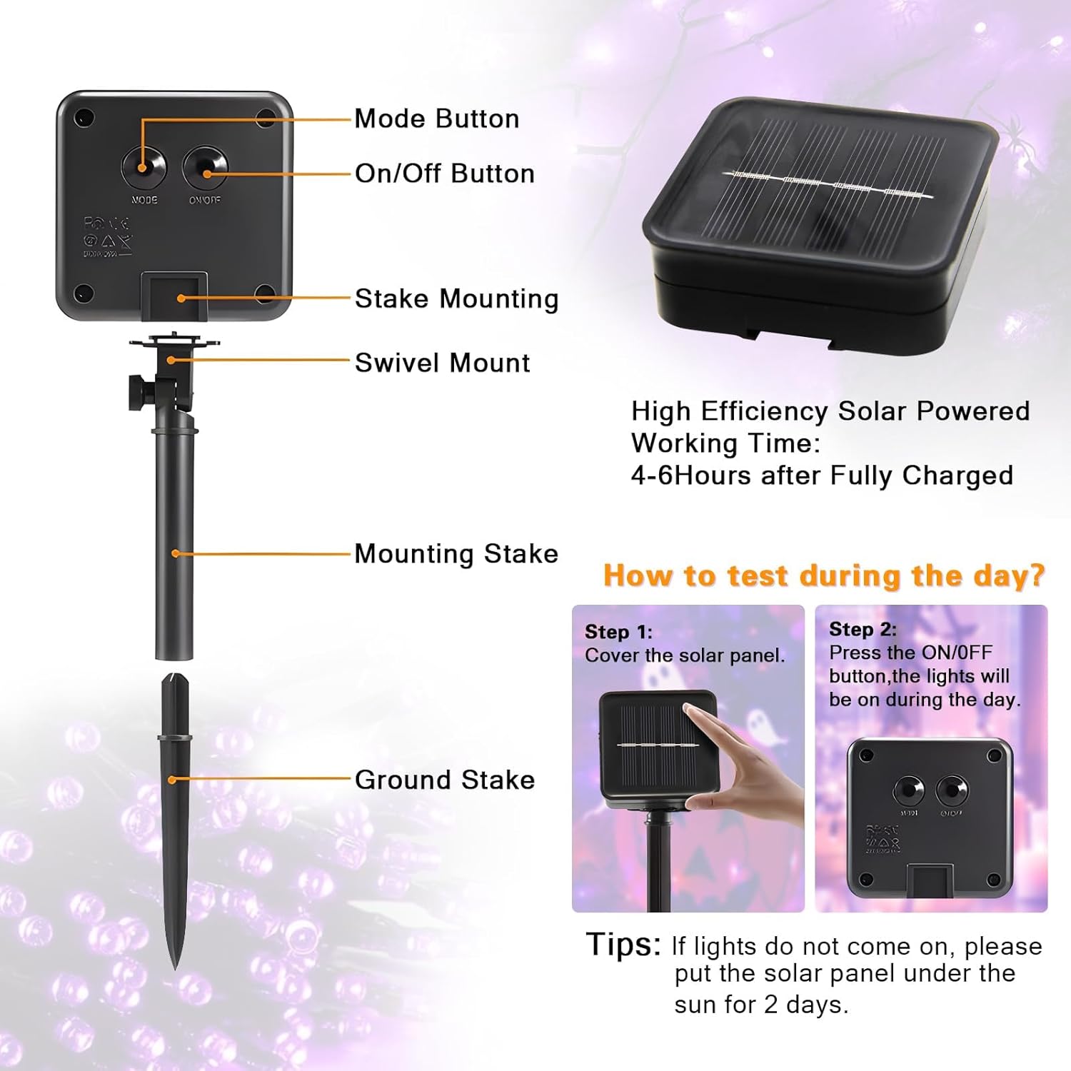 - 【Versatile Outdoor/Indoor String Lights】Solar Halloween string lights with a total of 6 strings allow you to be more flexible with your imagination and can be easily installed wherever you need to decorate. The solar lights can be molded into various shapes for gardens, patios, trees, porches, roofs, fences, bistros, restaurants, hotels, commercial buildings. It can also be used for parties, Halloween and New Year parties to create a warm and joyful holiday atmosphere.