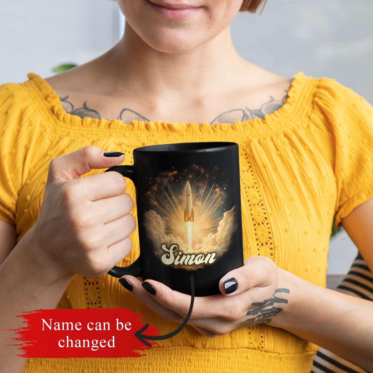 Sci-Fi Inspired Ceramic Mug for Men, Custom Name Coffee Mug 11oz or 15oz, Personalized Rocket Enthusiast Black Cup, Custom Vibrant Rocket Coffee Cup, Gifts for Astronaut Fans