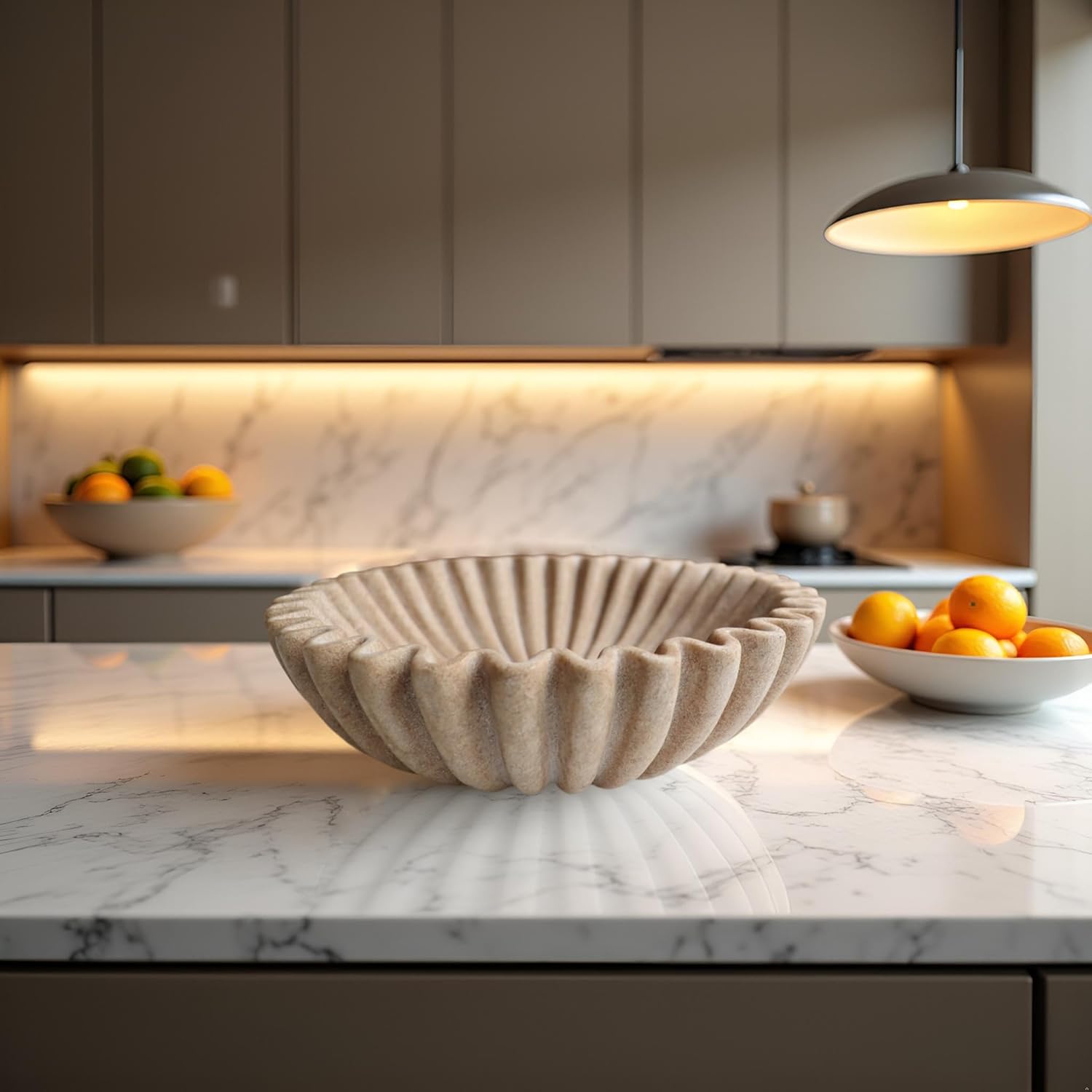 10" Large Decorative Bowl decor, Scalloped Bowls for Modern Home Decor,Ruffle Decor,Stylish Key Bowl for Entry Table,Decorative Fruit Bowl for Kitchen Counter,Artificial Stone Beige