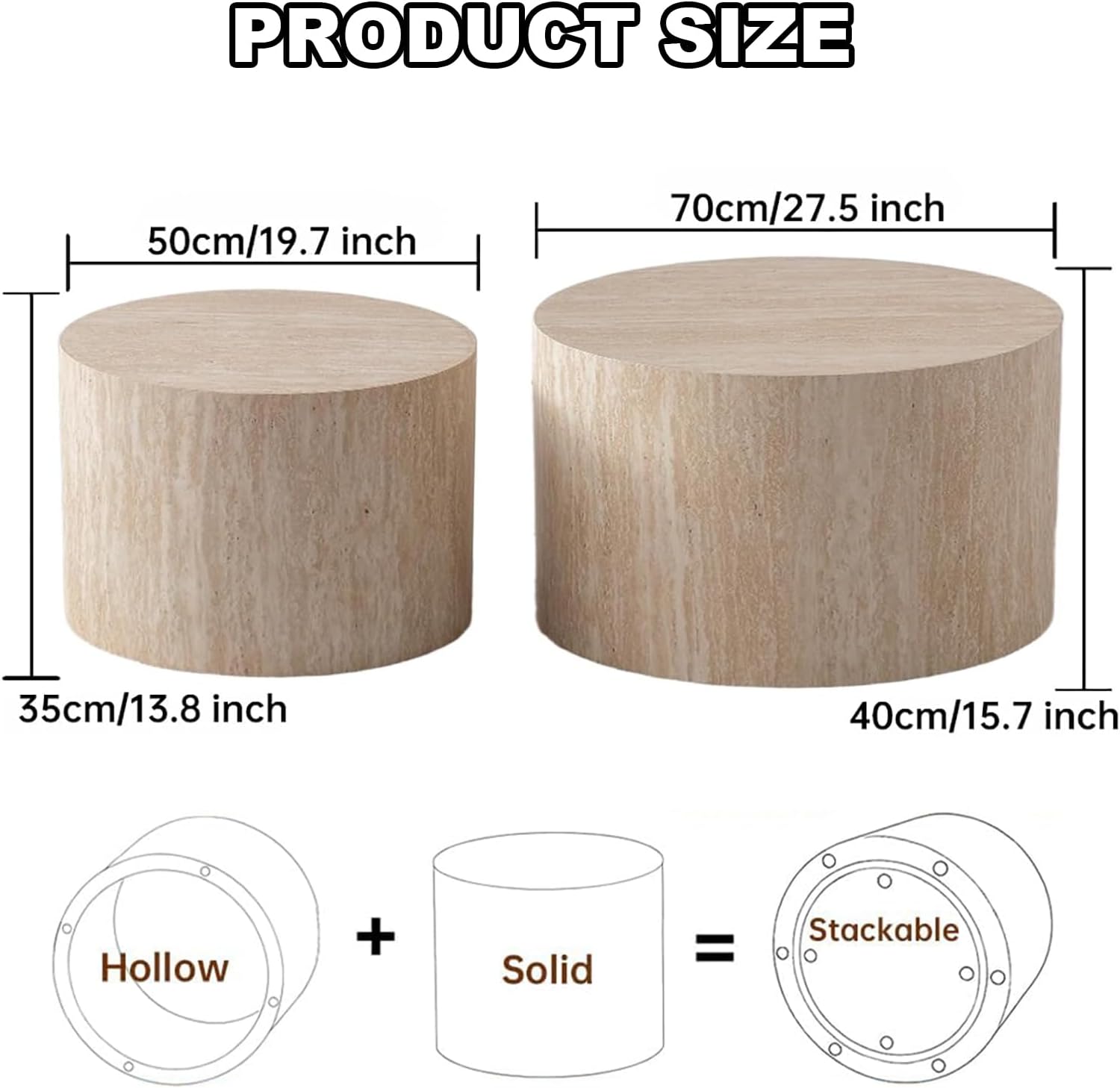 - Nesting Table Set of 2 - The end table set consists of one Coffee table (Φ 27.5 x H 15.7 inch) and one side table (Φ 19.7 x H 13.8 inch), which can be arranged in multiple ways. One large and one small, with a sense of space and hierarchy.