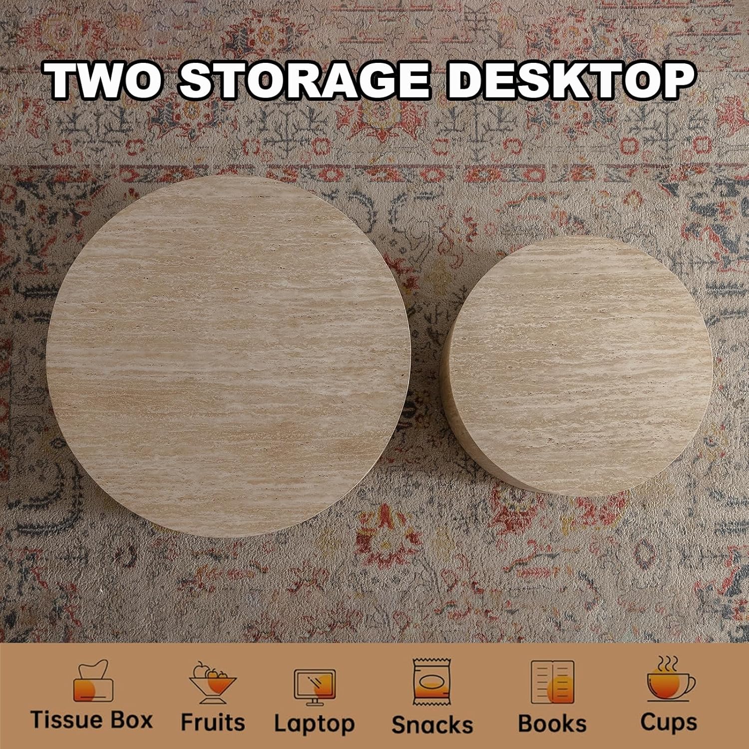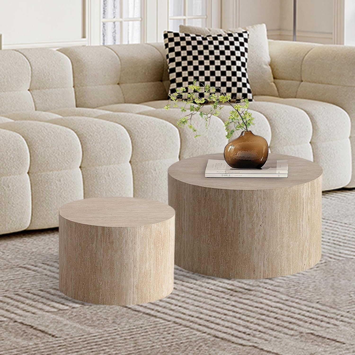 Round Nesting Coffee Table Set of 2, Modern Coffee and End Table Set Small Circle Wooden Drum Side Table Accent End Tables for Living Room Office, No Assembly,Travertine Large