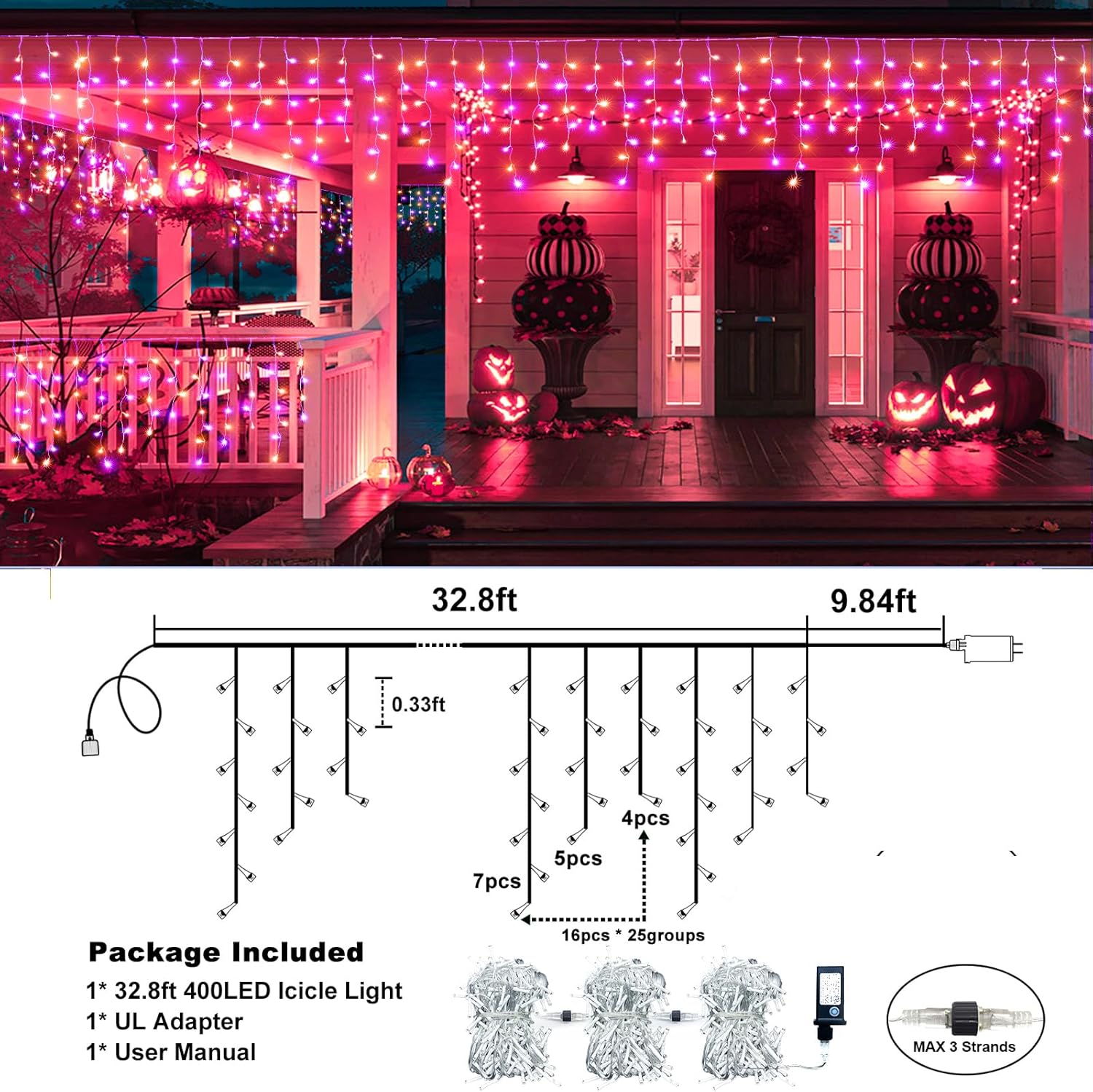 - Easy to Install & Connectable: These Halloween lights outdoor are super easy to set up. They can be connected up to 3 sets of icicle lights end to end, which is convenient for decorating broad areas. Our Halloween icicle lights can be easily draped or hung on the roofs, yards, window, patios, garden, fence or bedroom, creating a dreamy, romantic atmosphere.