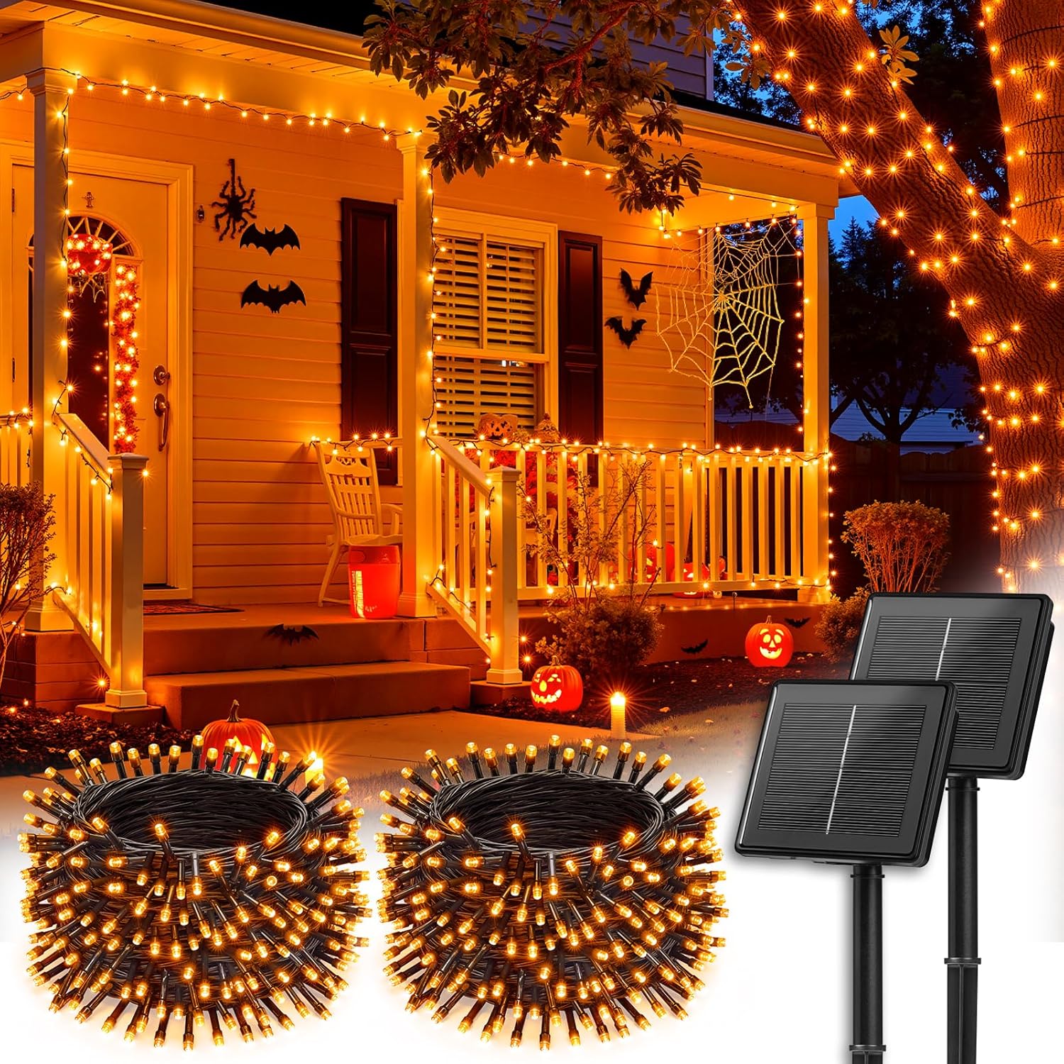 Brightown 2 Pack Halloween Solar String Lights Outdoor, Total 144Ft 400 LED Twinkle Fairy Lights Waterproof with 8 Modes Auto On/Off for Patio Tree Garden Party Home Decorations (Orange)