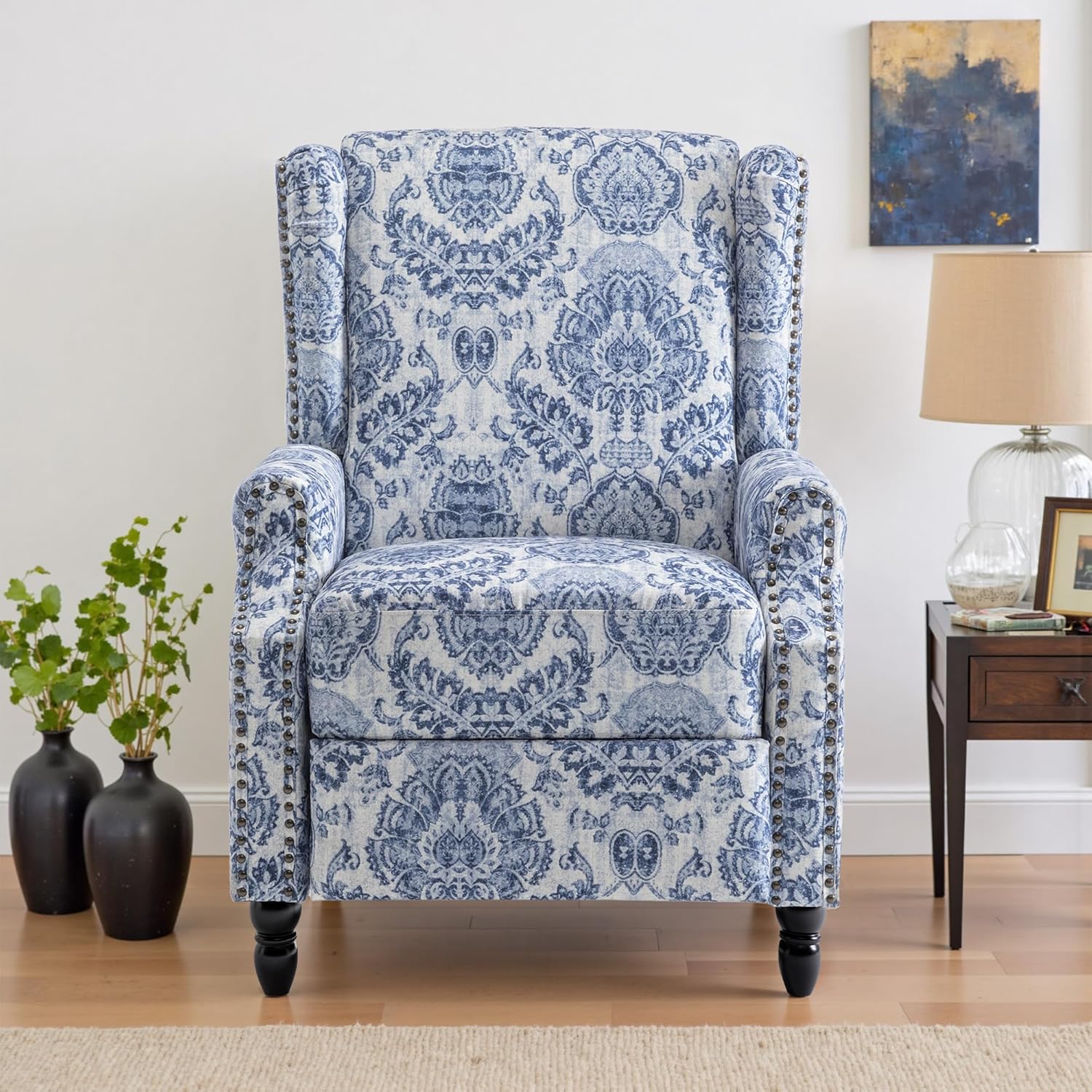 UIXE Floral Pushback Recliner Chair, Fabric Upholstered Armchair Push Back Accent Chair for Living Room, Rivet Trim Club Chair Home Theater Single Sofa Reading Seat - Navy Blue