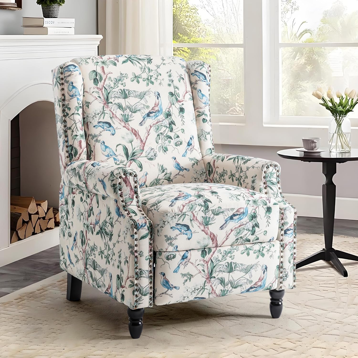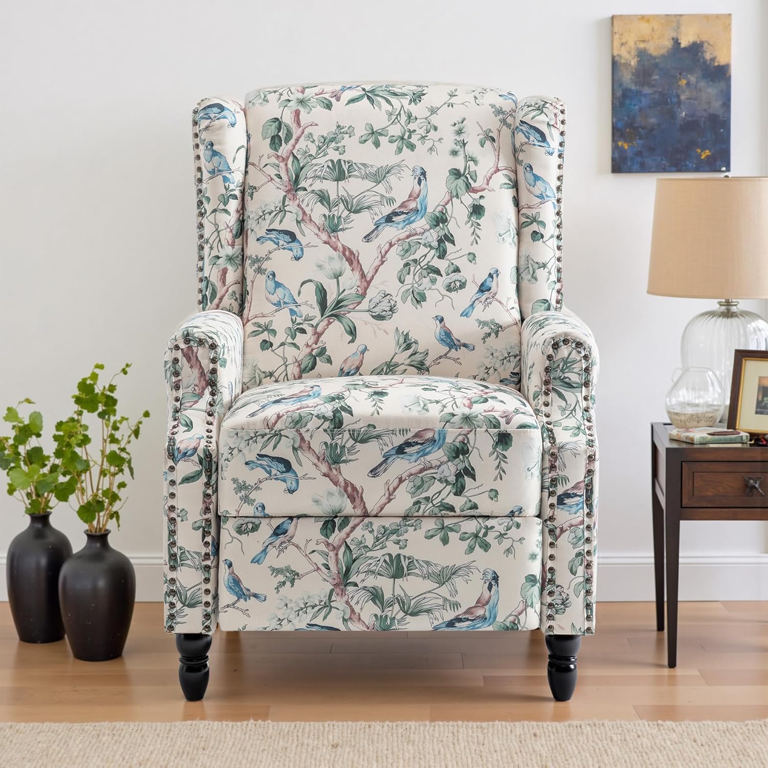 UIXE Floral Pushback Recliner Chair, Fabric Upholstered Armchair Push Back Accent Chair for Living Room, Rivet Trim Club Chair Home Theater Single Sofa Reading Seat - Bird
