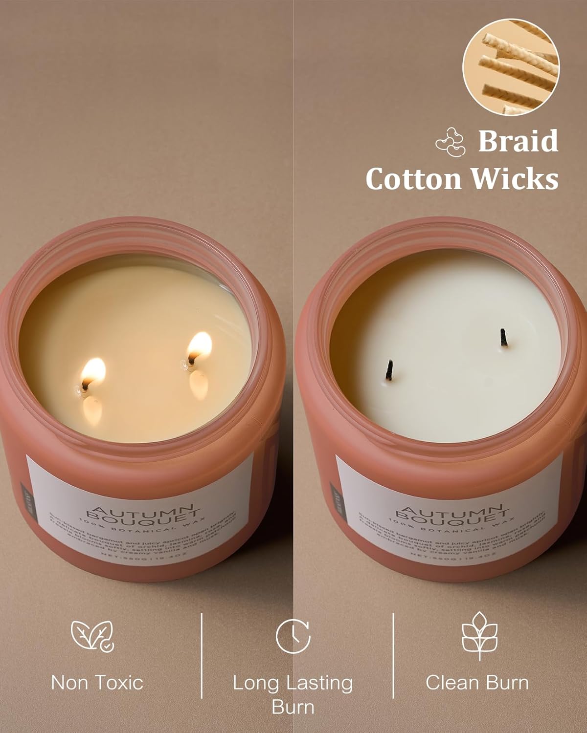 - Clean Consistent & Even Burn - Using 2 American made lead-free cotton wicks for a even burn result. They're cotton flat braid wicks with paper throughout, providing increased rigidity and burn more consistently than 100% cotton wicks. Designed to reduce carbon buildup which leads to black soot