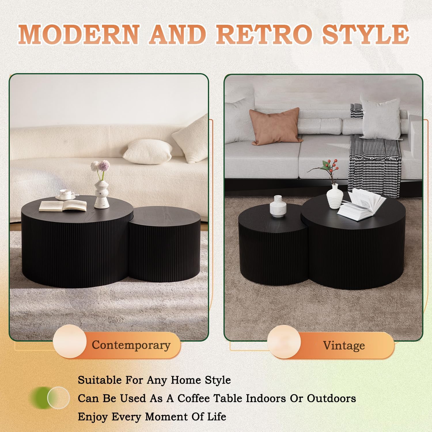 - A Fusion of Modern and Classic Styles: The 2 piece nesting coffee table combines faux wood grain texture with sleek circular form, making it adaptable to both contemporary and traditional interiors. Whether in a minimalist setting or alongside vintage décor, the nesting coffee tables for living room harmonizes effortlessly with diverse styles.
