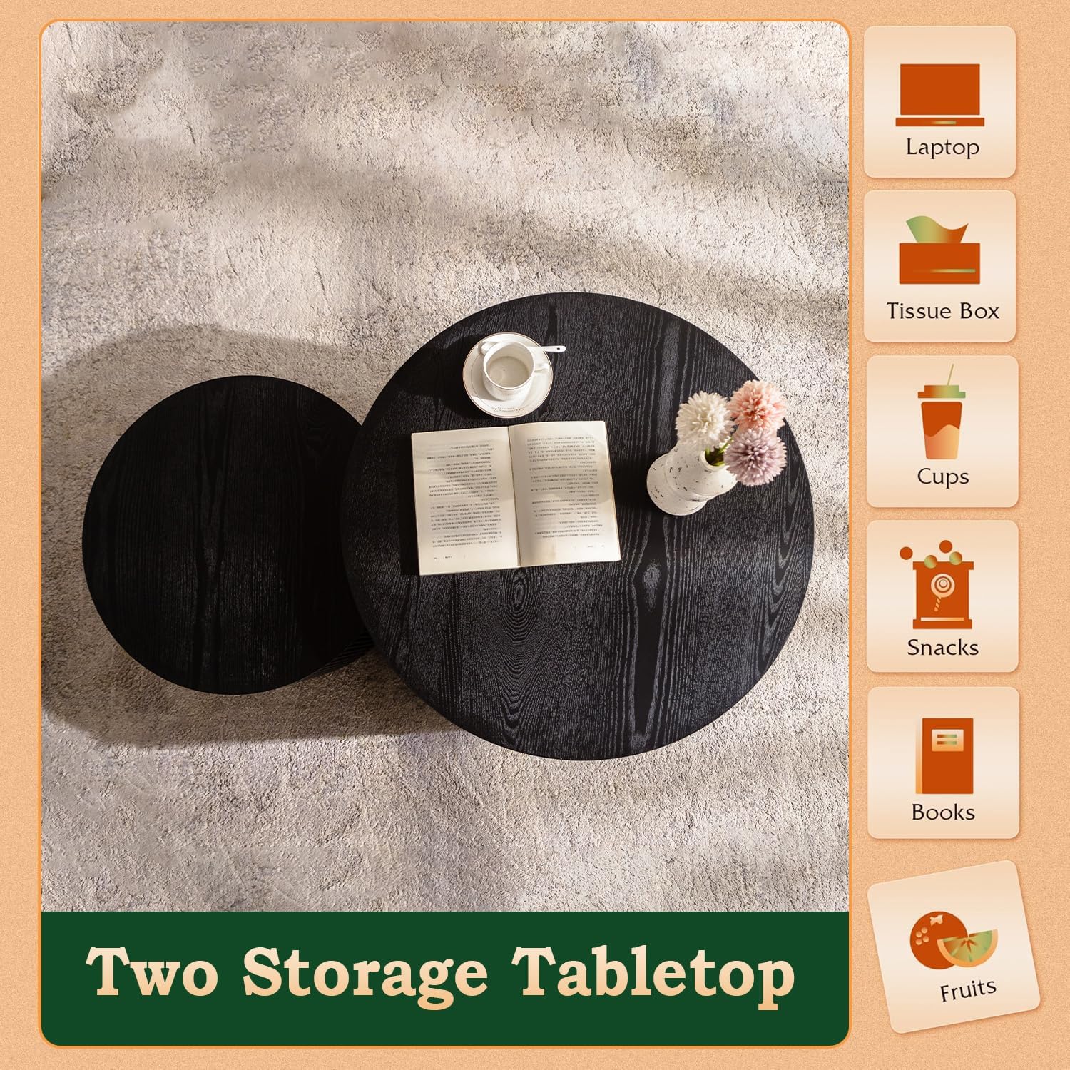 - Space-Saving Nesting Feature: Designed as a duo, the nesting coffee table round consists of one hollow large table and one solid smaller table. The smaller table conveniently fits under the larger one, optimizing space while offering flexible functionality. No assembly is neededâjust unpack and use immediately.