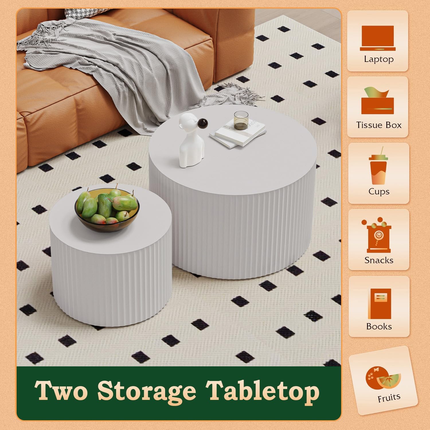 - Space-Saving Nesting Feature: Designed as a duo, the nesting coffee table round consists of one hollow large table and one solid smaller table. The smaller table conveniently fits under the larger one, optimizing space while offering flexible functionality. No assembly is neededâjust unpack and use immediately.
