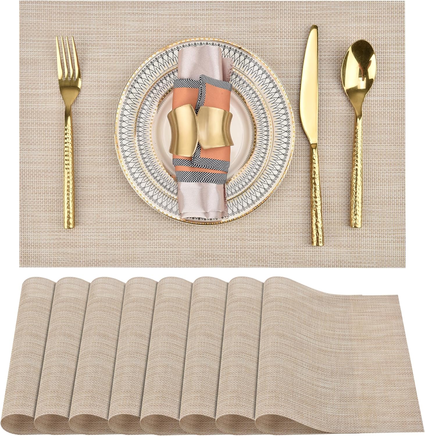 Placemats Set of 8 - Easy Clean Washable Vinyl Placemats - Wipeable Heat Resistant Table Mats for Dining Table - 17.7x11.8 Inch (8, Beige)