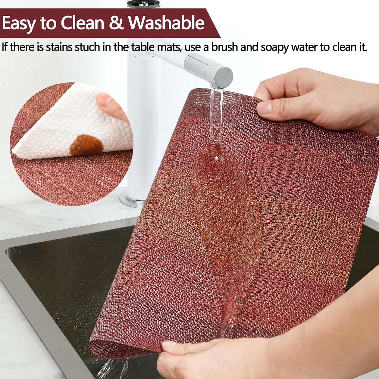 - Easy to Clean: Washable placemats easy to clean, water and oil proof, hand wash in warm soapy water and wipe dry, if there is stains stuch in the table mats, use a brush and soapy water to clean the placemats. This placemat is vertically woven and thickened, but it will have some tiny pores. It is recommended to clean in time after dinner. Size is 17.7x12 Inch (45x30cm) hand cut, there may be 0.2 inch error