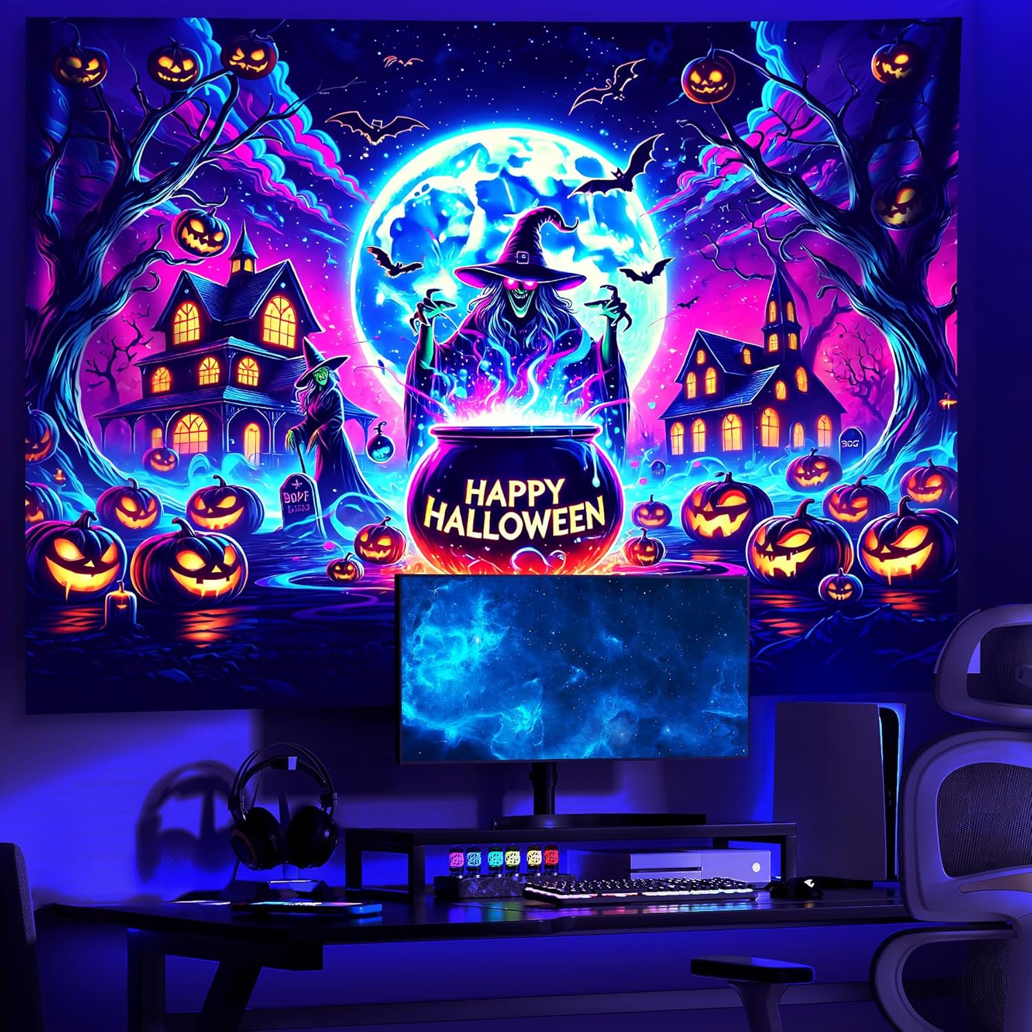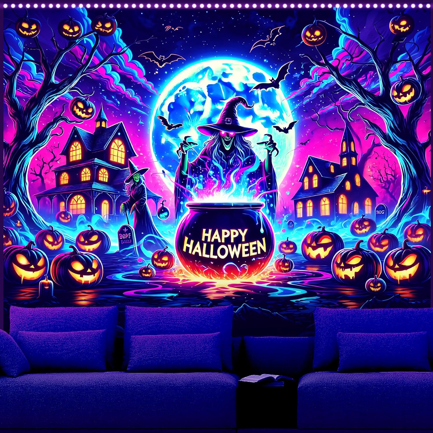 AOHMPT Glow-in-the-Dark Halloween Tapestry - UV Reactive Black Light Wall Hanging Decor for Spooky Parties, Bedroom, Living Room (Witch-Haunted House, 79L x 59W, Unframed)