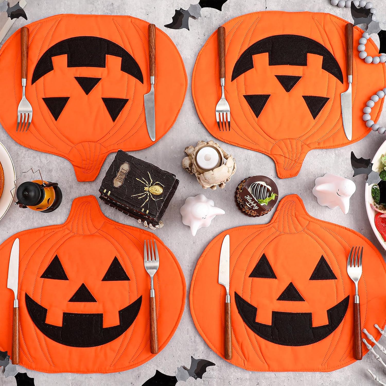 - Pumpkin Shaped Placemats: you will receive a set of 4 Halloween pumpkin placemats, featuring a simulated Jack o Pumpkin design that adds festive charm to your dining table; They are composed of classic orange and black combinations, idea for creating a harvest and spooky atmosphere at family gatherings or holiday celebrations