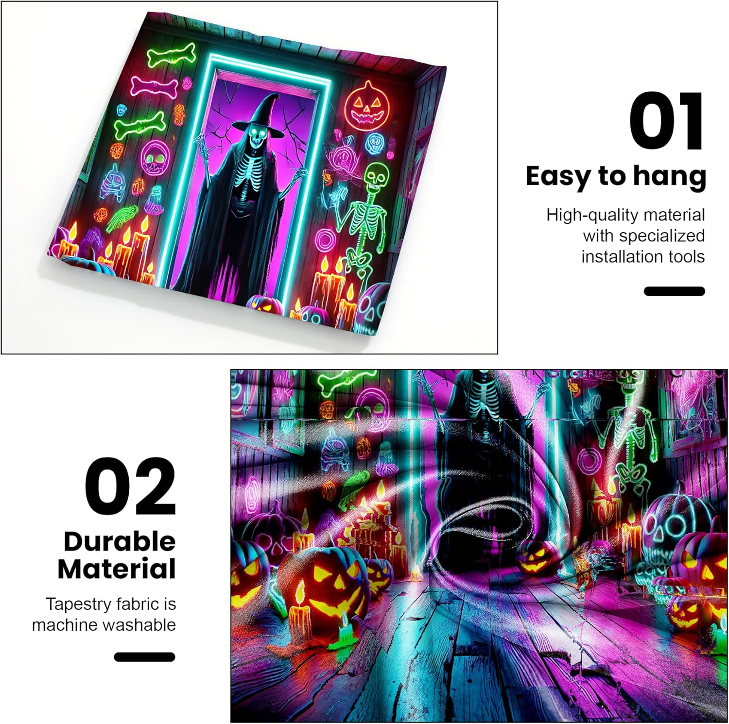 - 【Spooky UV Magic】This Halloween tapestry glows vividly under blacklight, creating an eerie, eye-catching display perfect for haunted houses, parties, or year-round horror-themed decor.