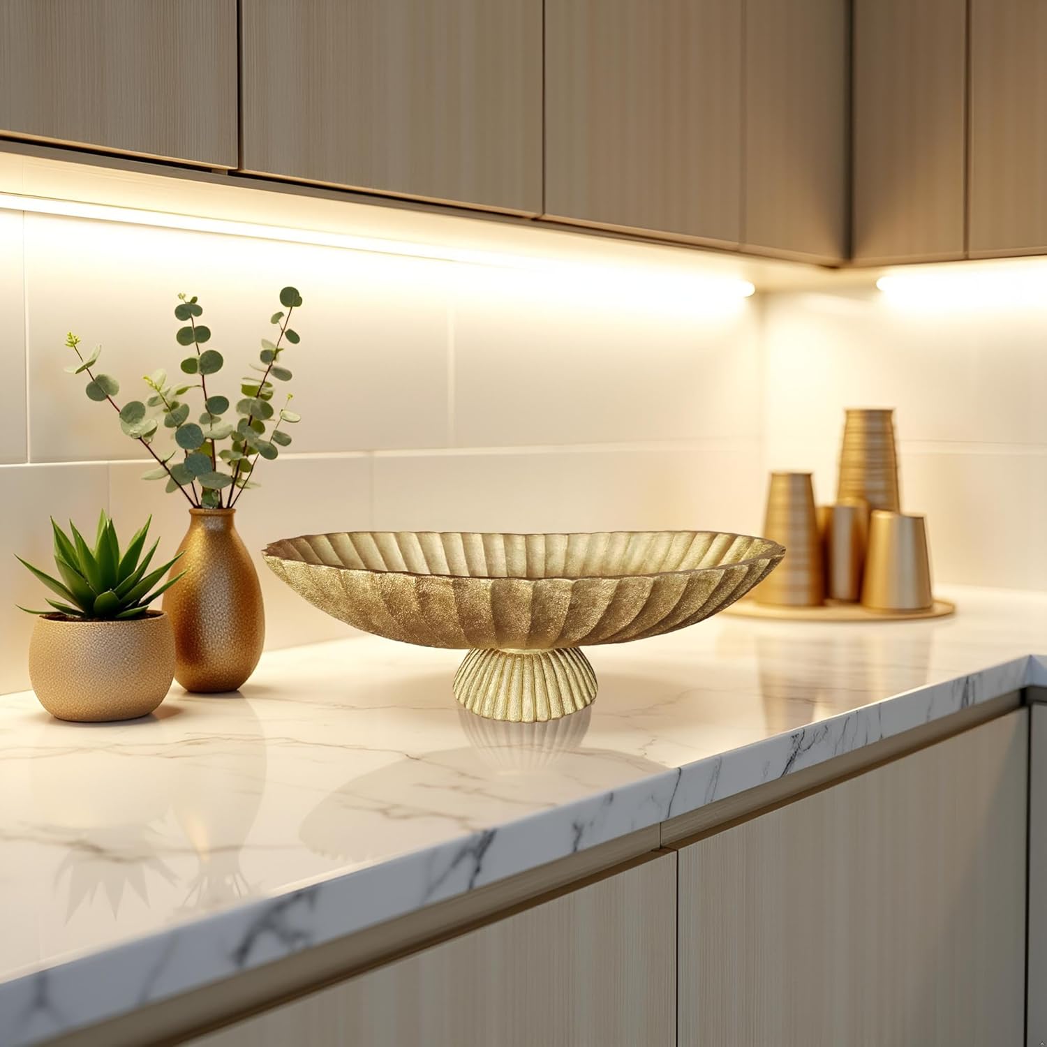 14.5" Large Decorative Long Bowl decor - Fluted Scalloped Decorative Bowls for Home Decor - Ruffle Decor,Stylish Key Bowl for Entry Table,Decorative Fruit Bowls for Kitchen Counter,Golden