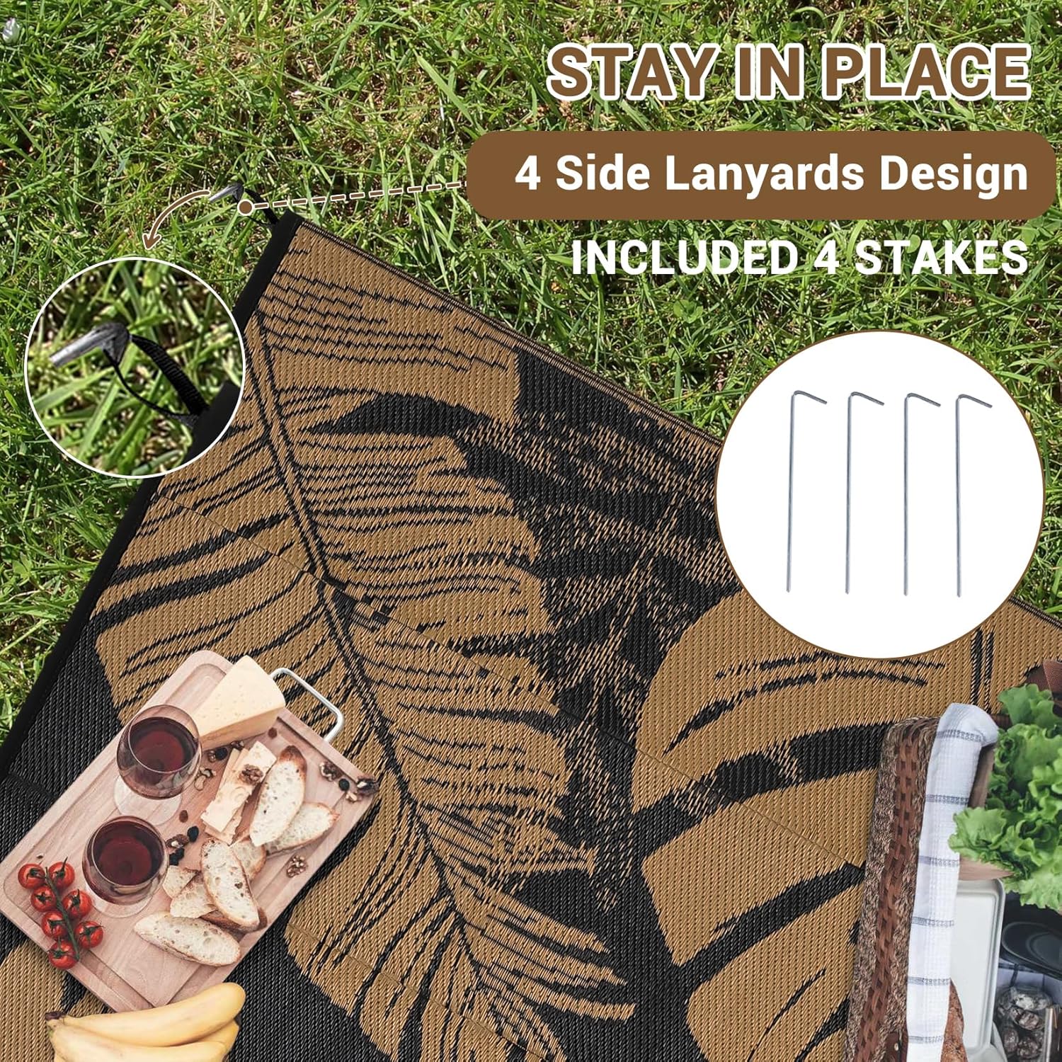 - Foldable & Portable: Take this picnic mat anywhere with its lightweight, foldable design. Includes four stakes and a portable bag for secure placement and easy transport, making it ideal as a beach mat, camping rug, or travel deck rug for outdoor fun