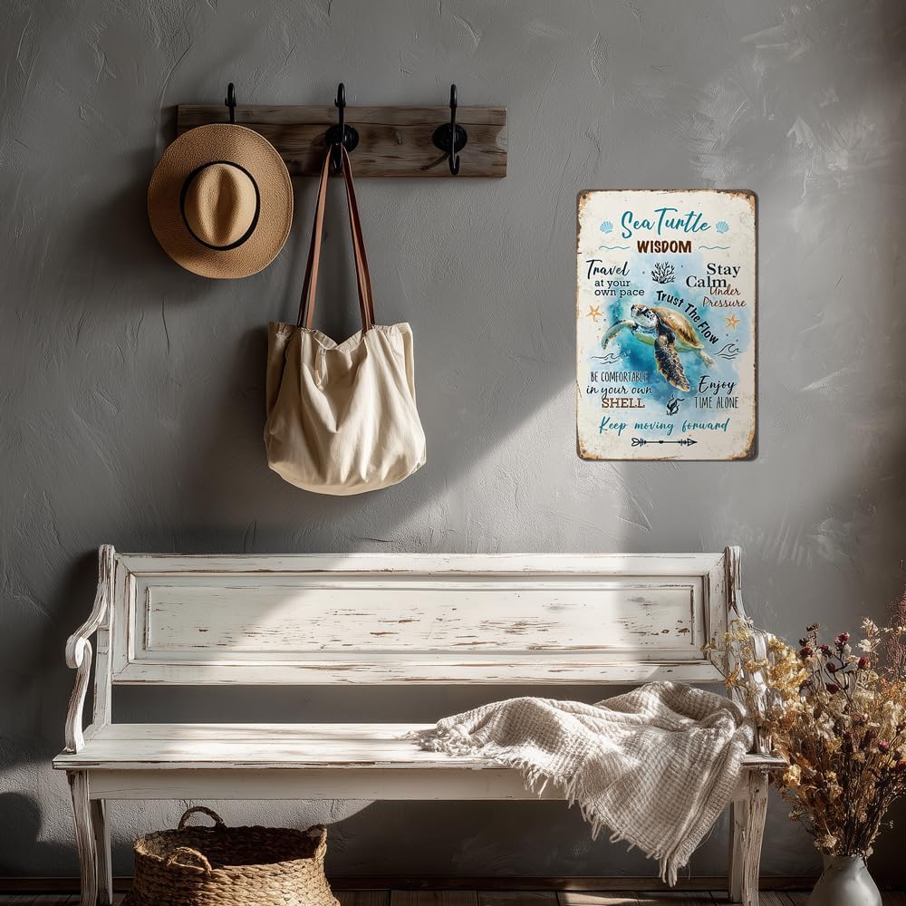 Heuhuww Retro Sea Turtle Wisdom Metal Sign for Home Office Room-Inspirational Beach Decor-Sea Turtle Quote Gifts for Ocean Lovers 12" x 8"(H16)